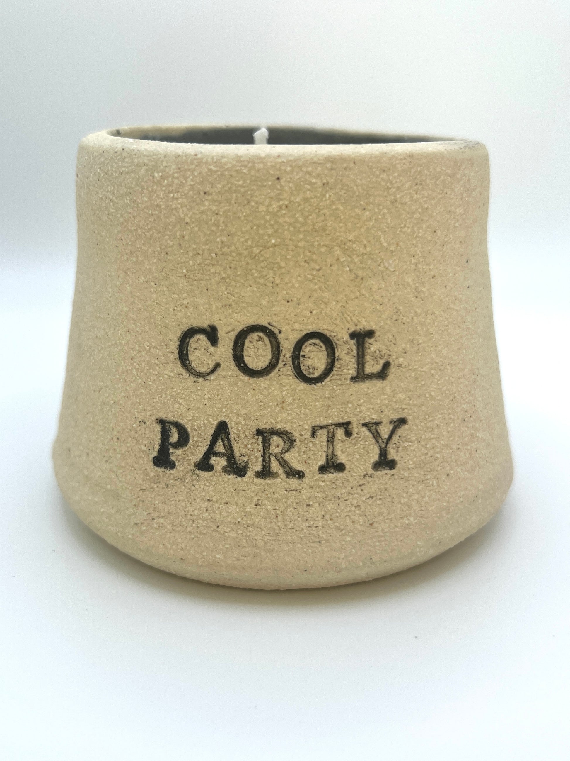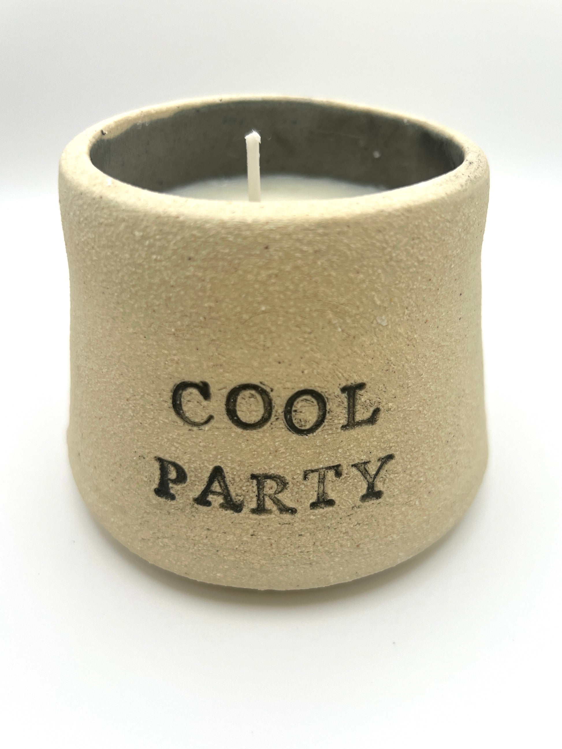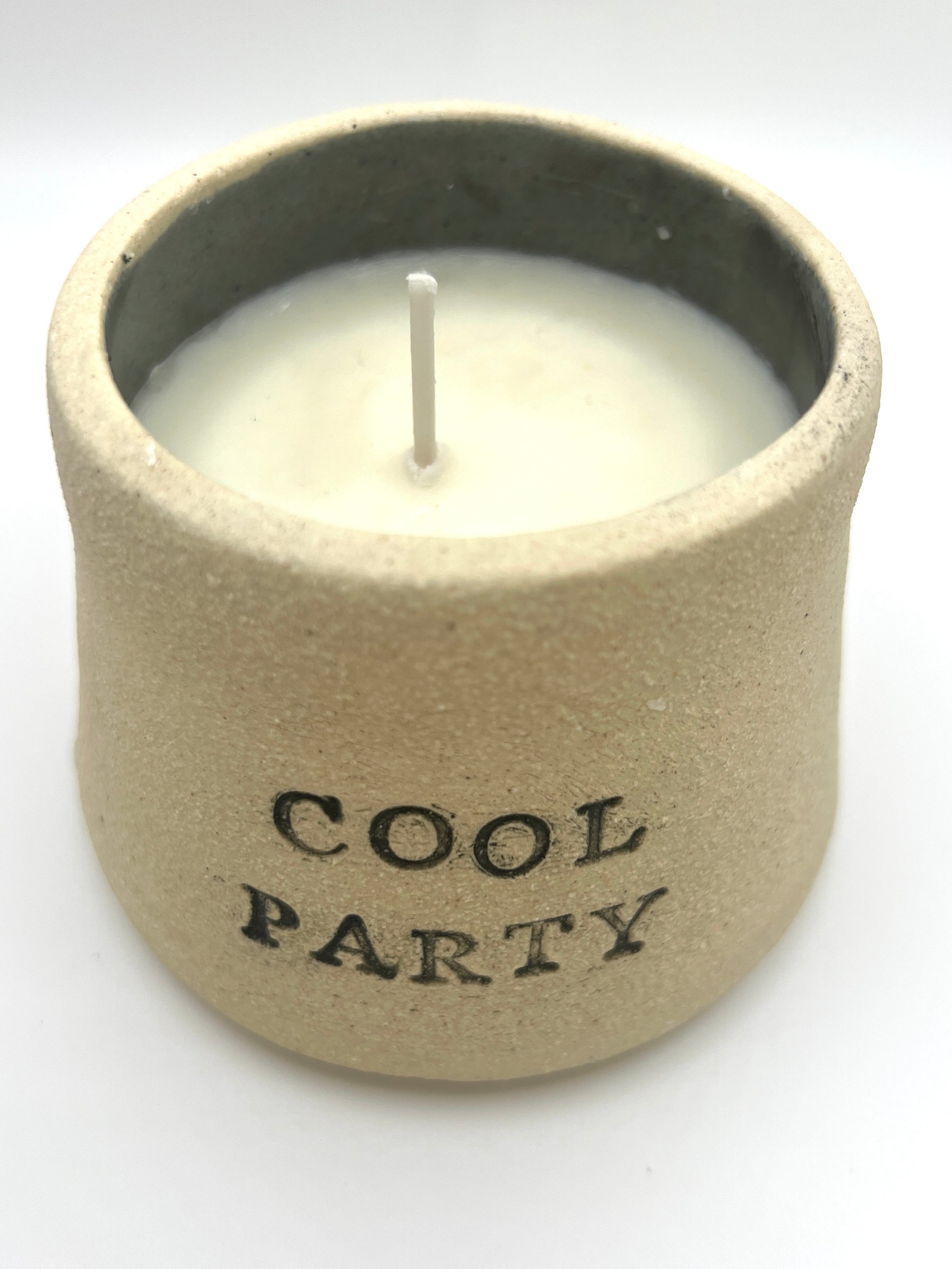 Handmade and handpoured ceramic candle with a gentle vanilla scent. Candles are approximately 4"x3" with a raw stoneware exterior and dark grey interior.