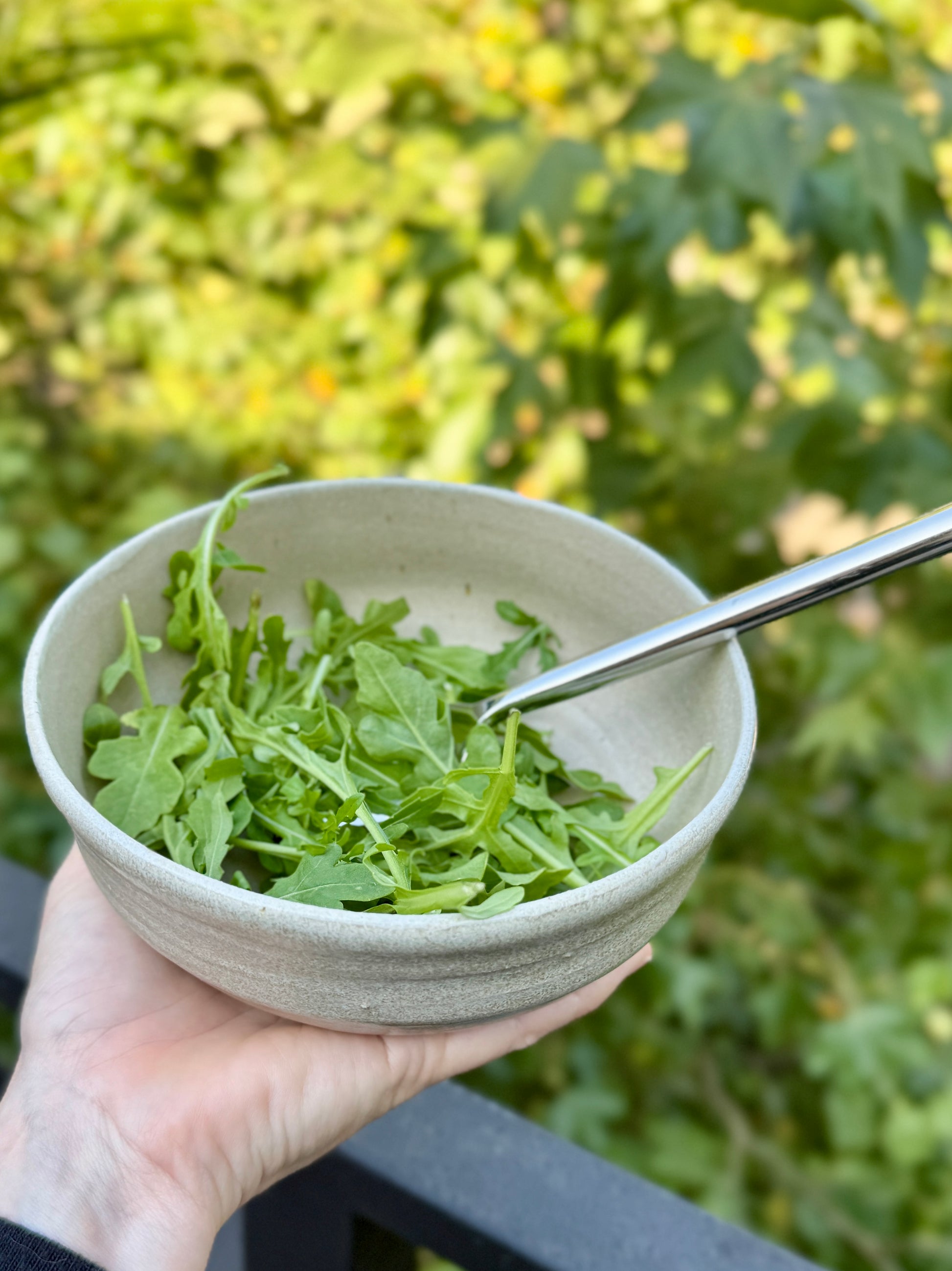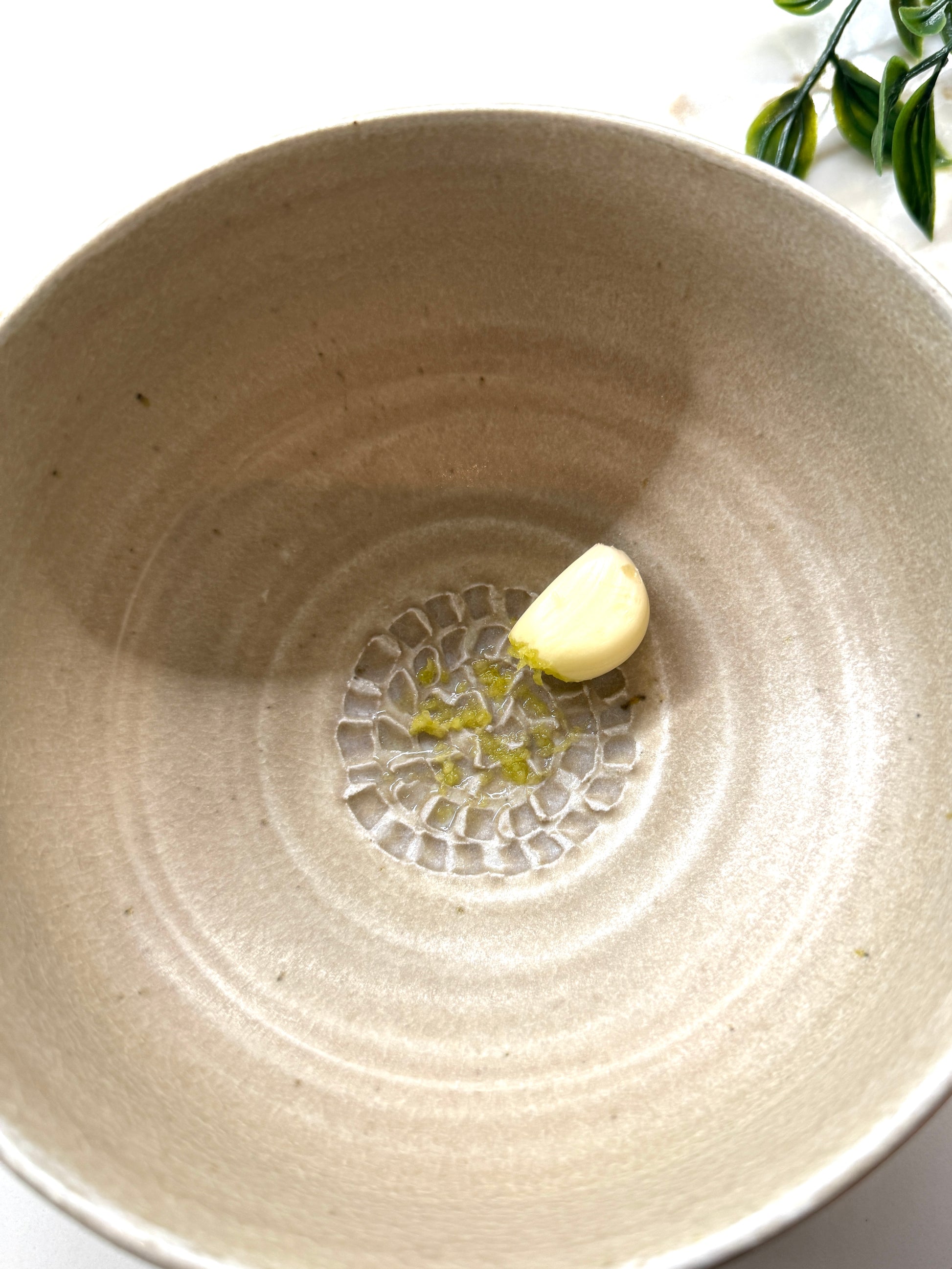 A bowl with a built in garlic grater at the bottom. Perfect for a quick salad with homemade dressing or a simple pasta. Eating alone can still be a luxury! Food and dishwasher safe. 6"x3".