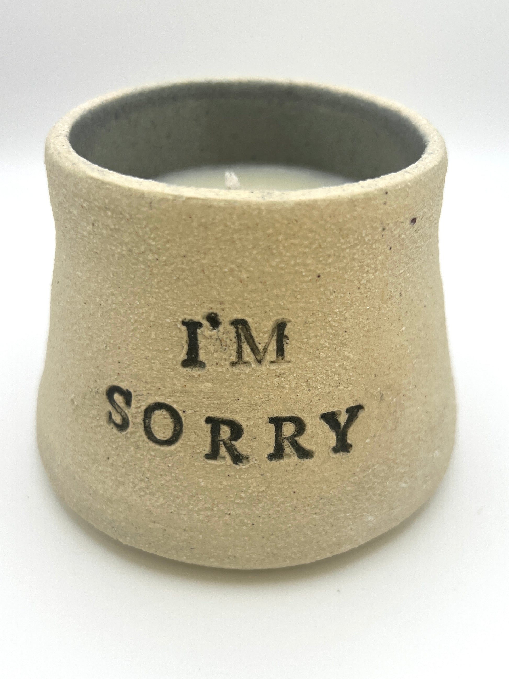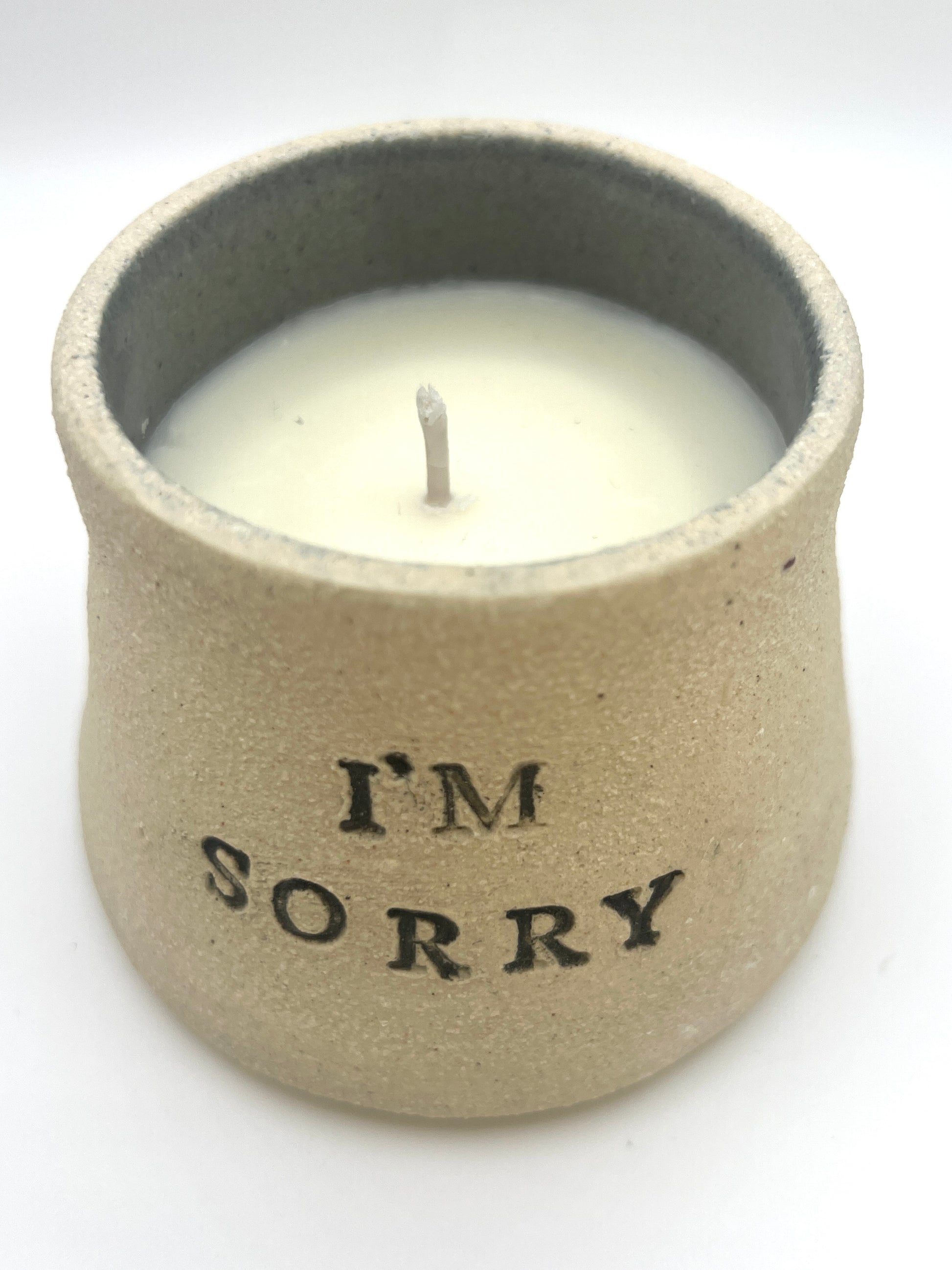Handmade and handpoured ceramic candle with a gentle vanilla scent. Candles are approximately 4"x3" with a raw stoneware exterior and dark grey interior.