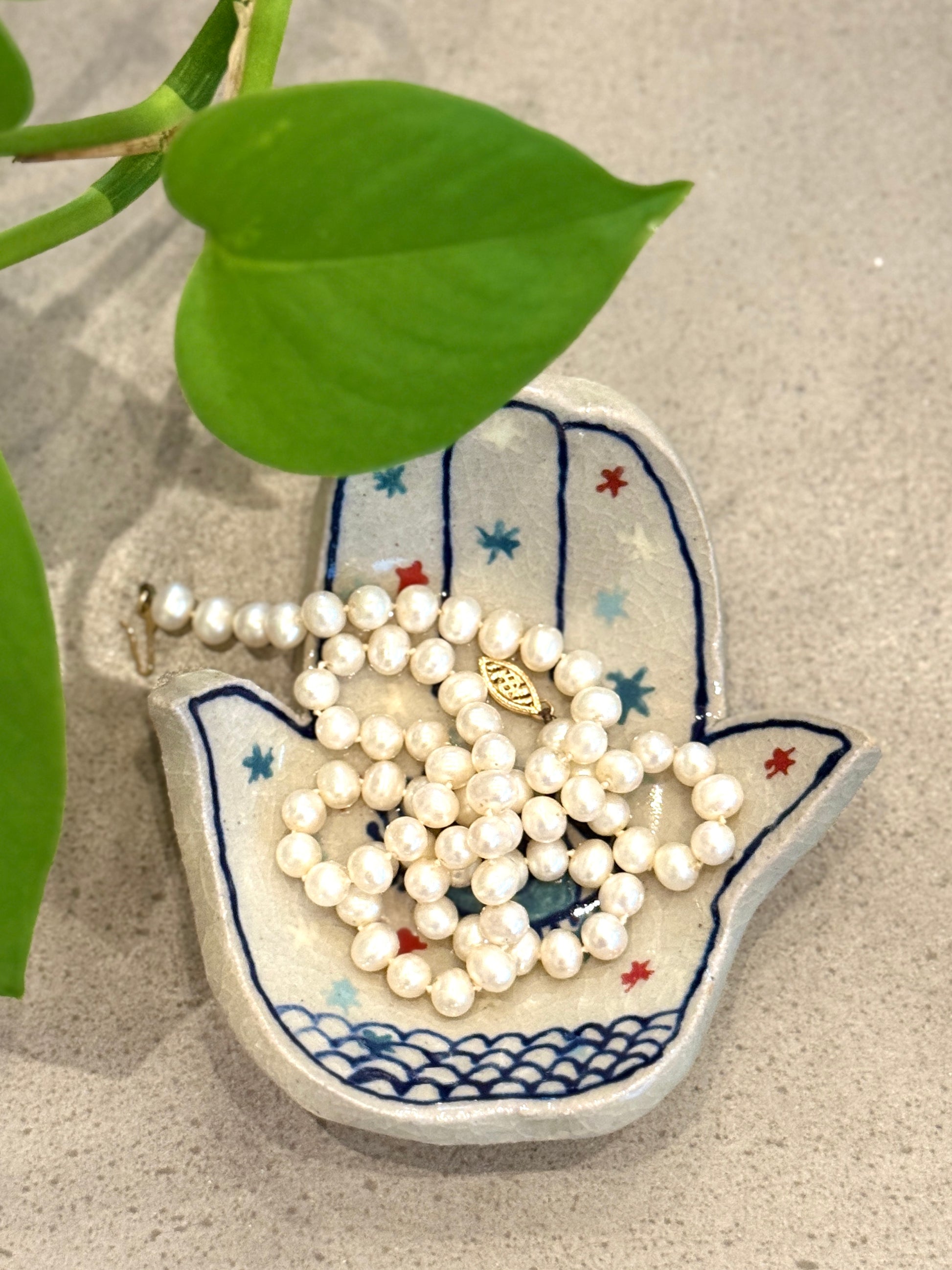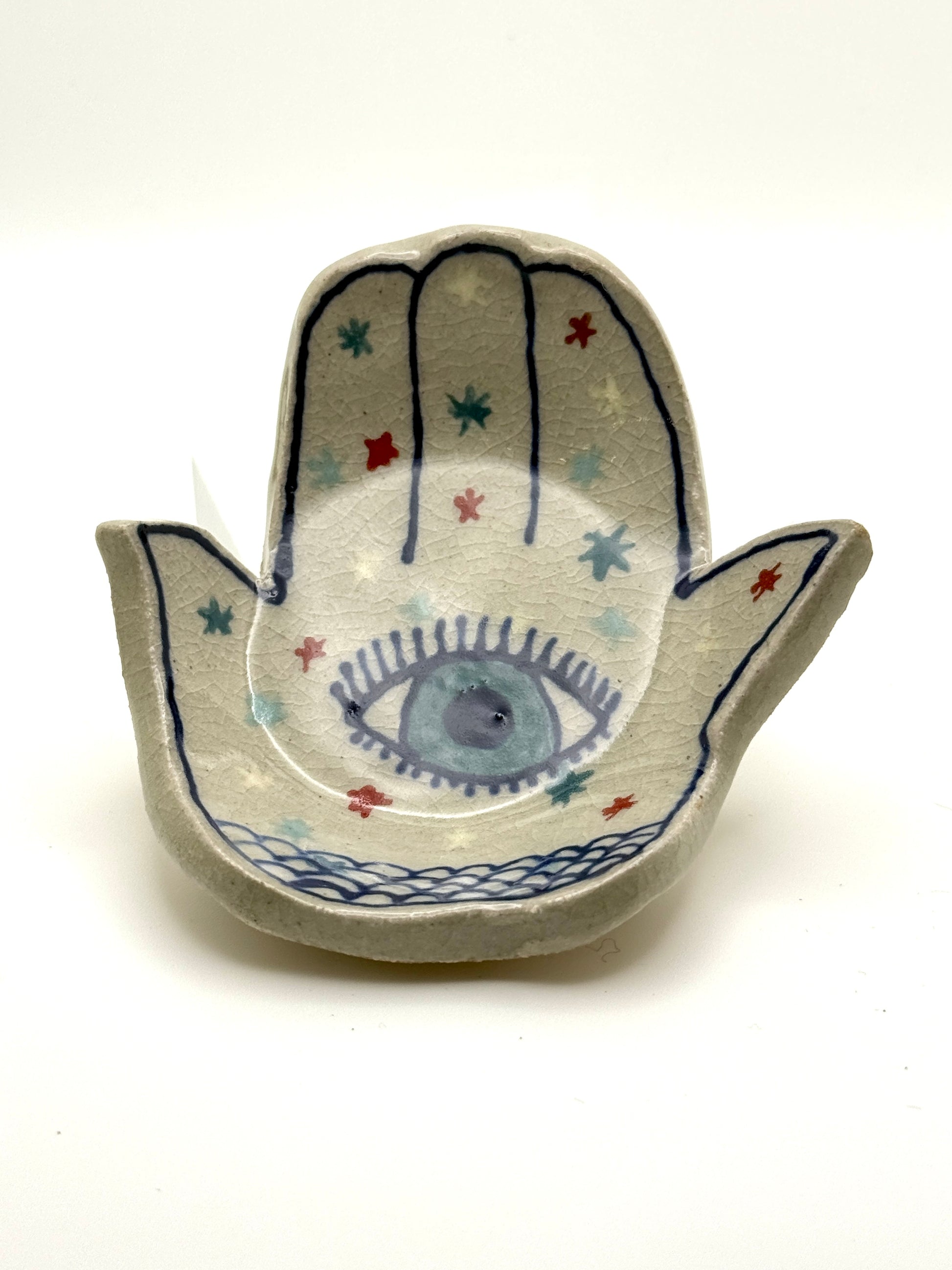 Good vibes only with this hand painted and hand molded ceramichamsa dish. Measures approximately 3.5"x4".