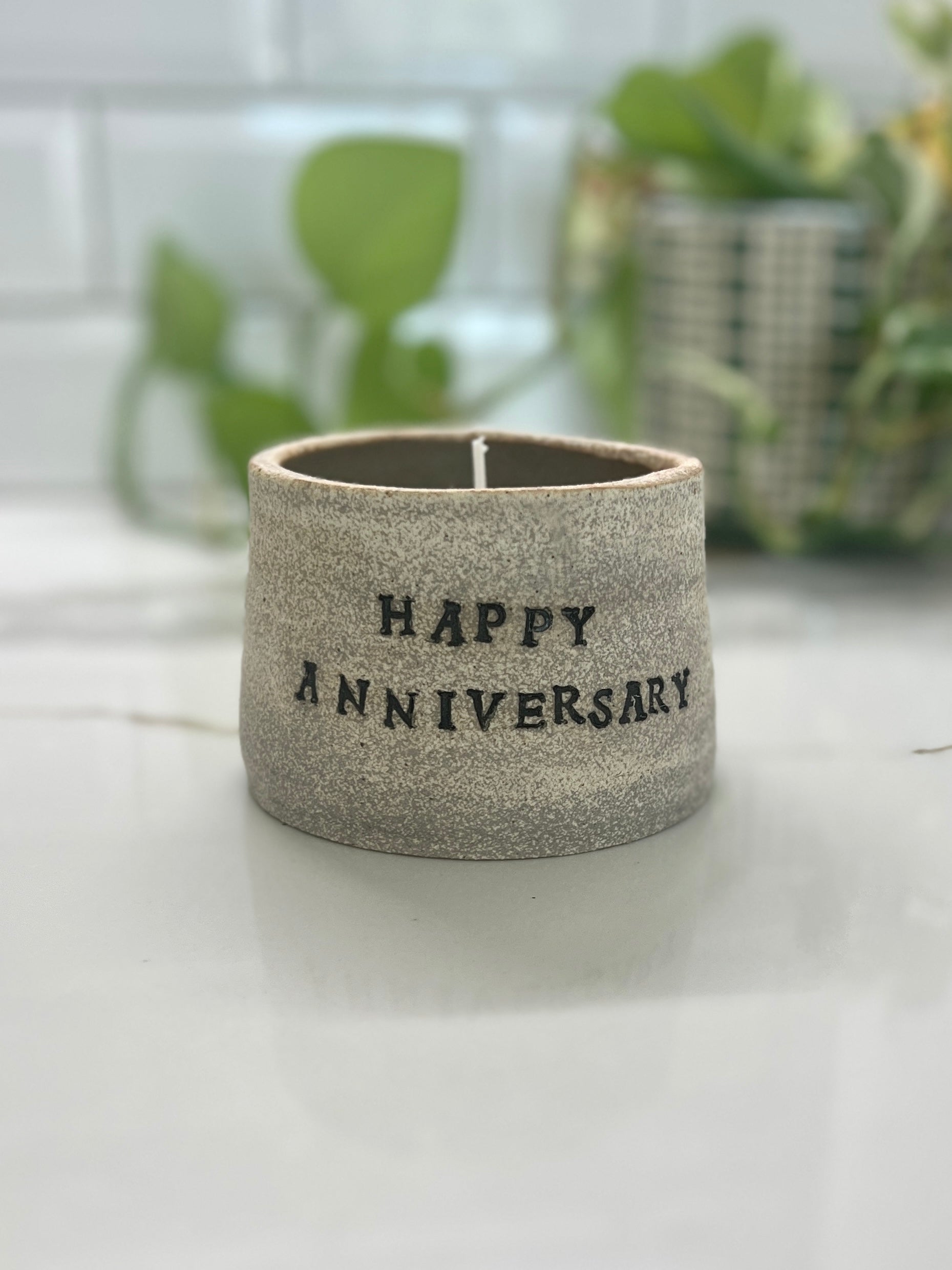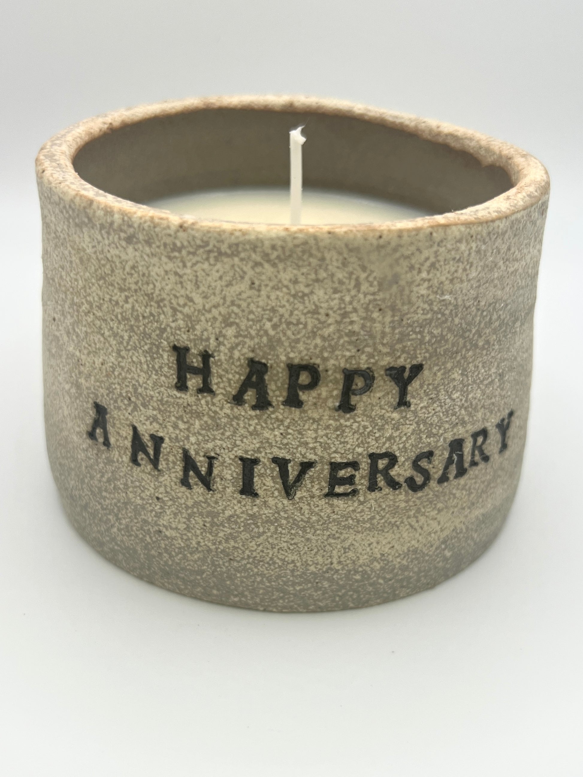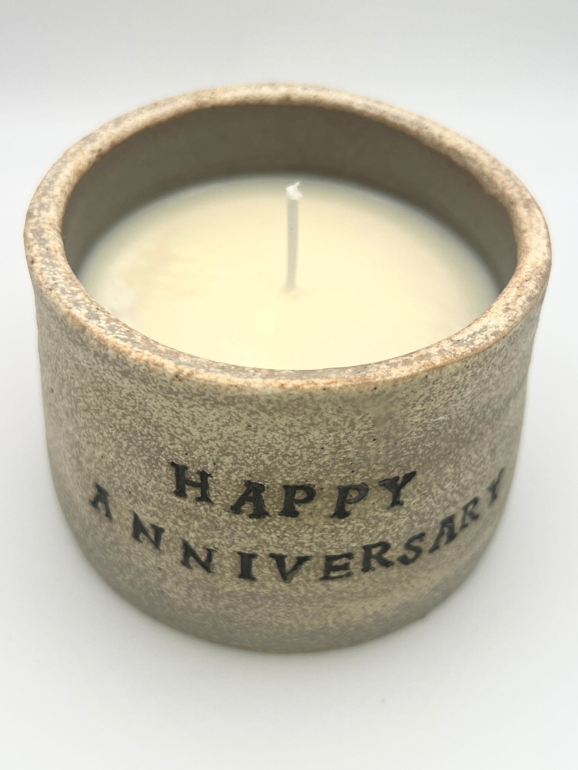 Handmade and handpoured ceramic "Happy Anniversary" soy candle with a gentle vanilla scent. Perfect for both the 8th and 9th traditional anniversaries (or any anniversary that needs celebrating). Candles are approximately 4"x3" with a granite stoneware exterior and dove grey interior.