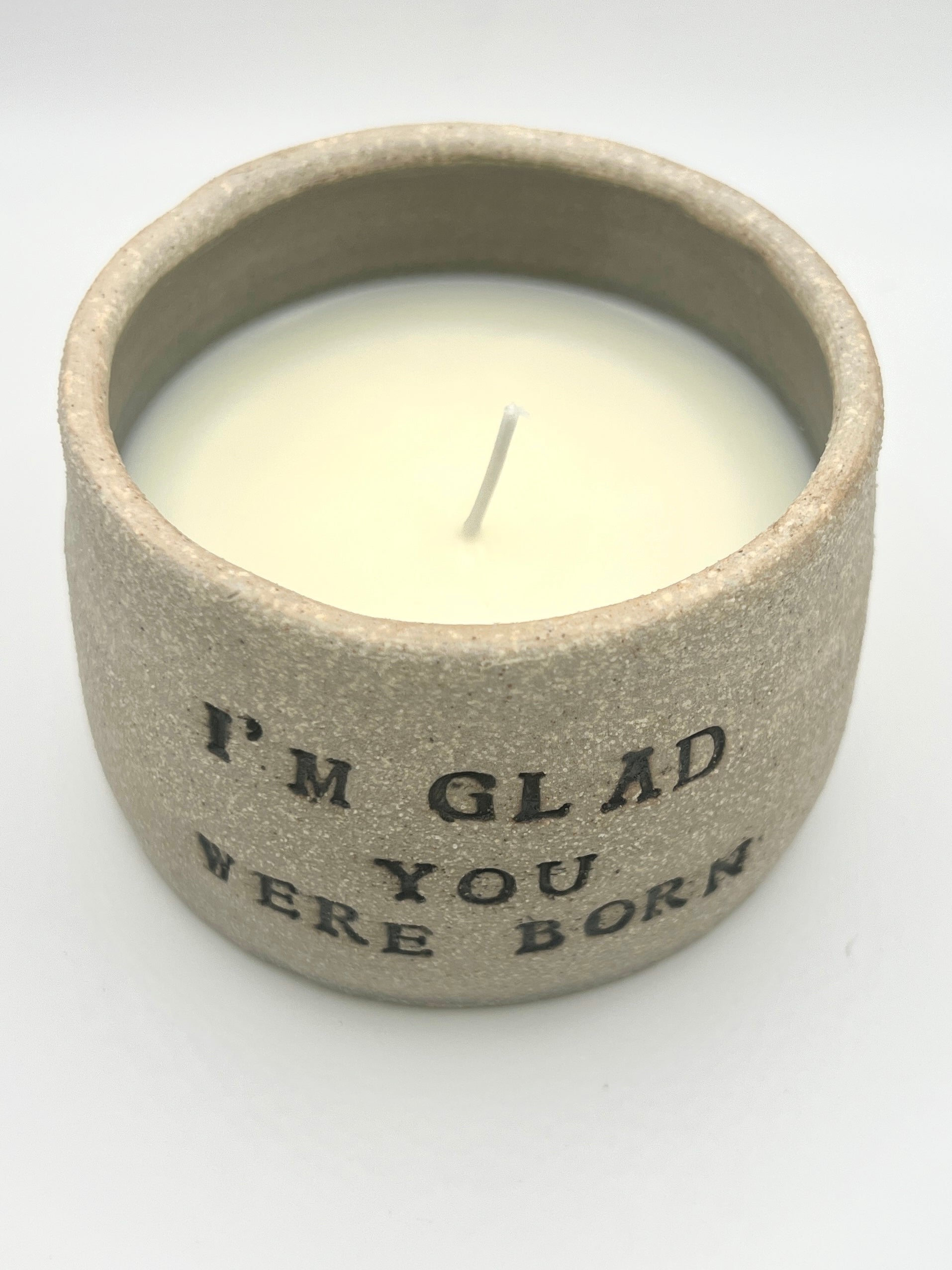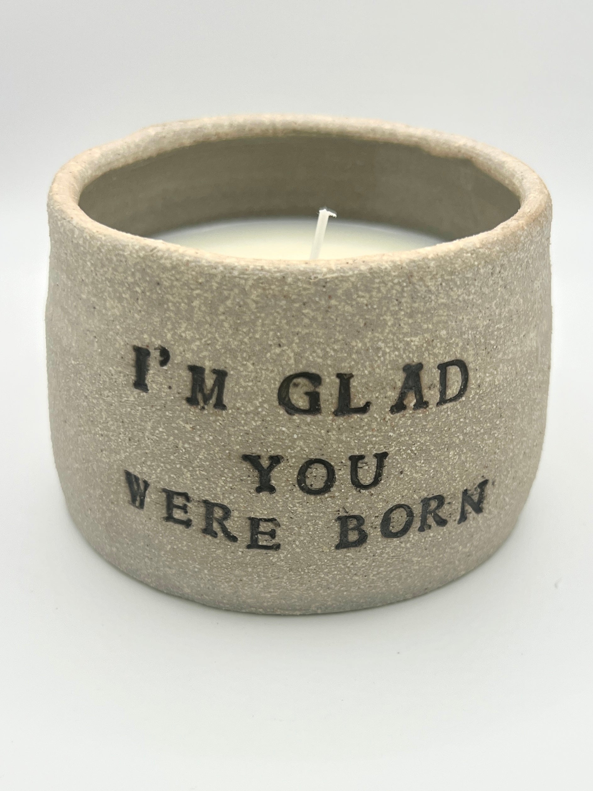 Handmade and handpoured ceramic "I'm Glad You Were Born" soy candle with a gentle vanilla scent. Perfect for new babies or birthdays. Candles are approximately 4"x3" with a granite stoneware exterior and dove grey interior.