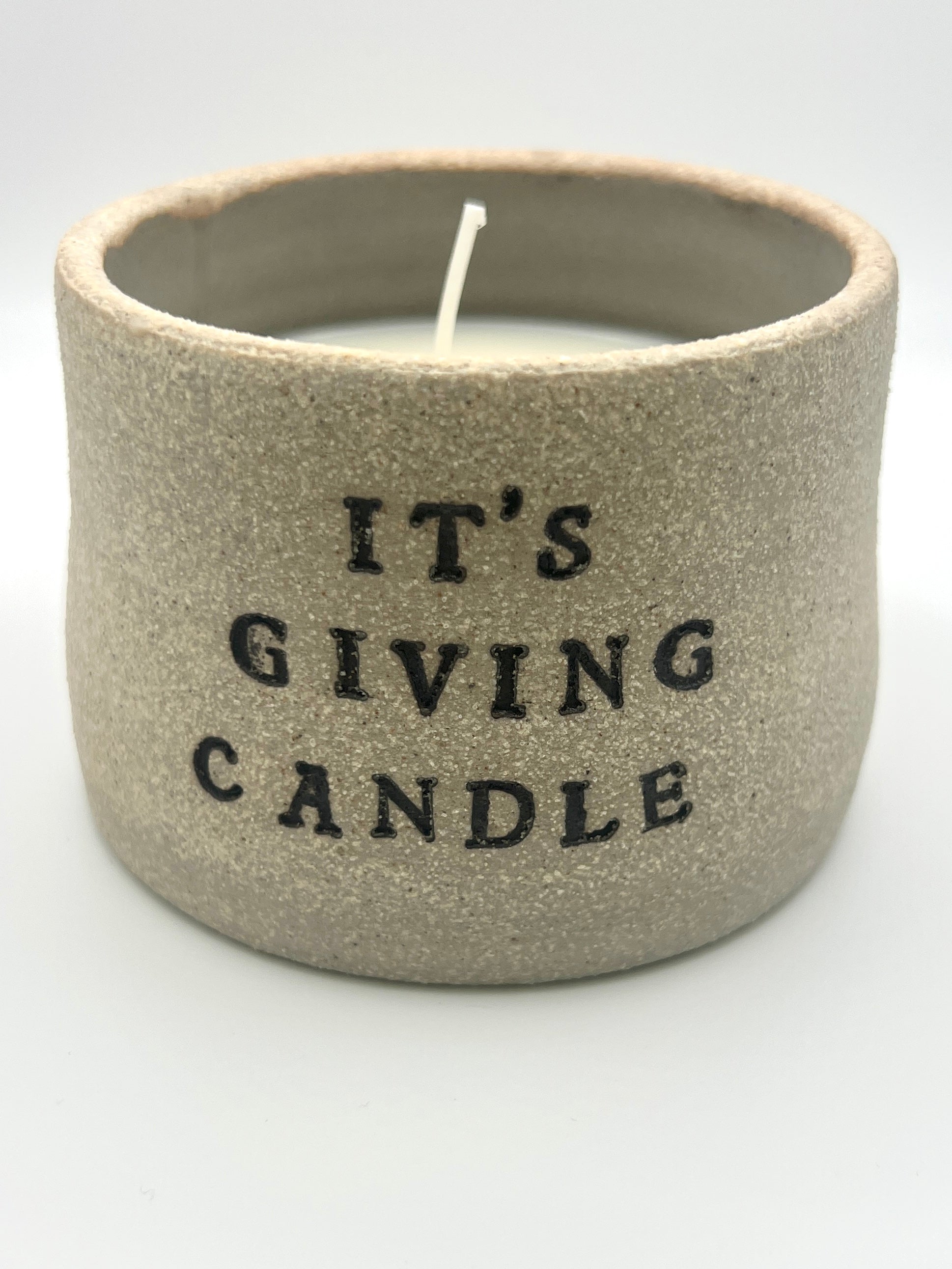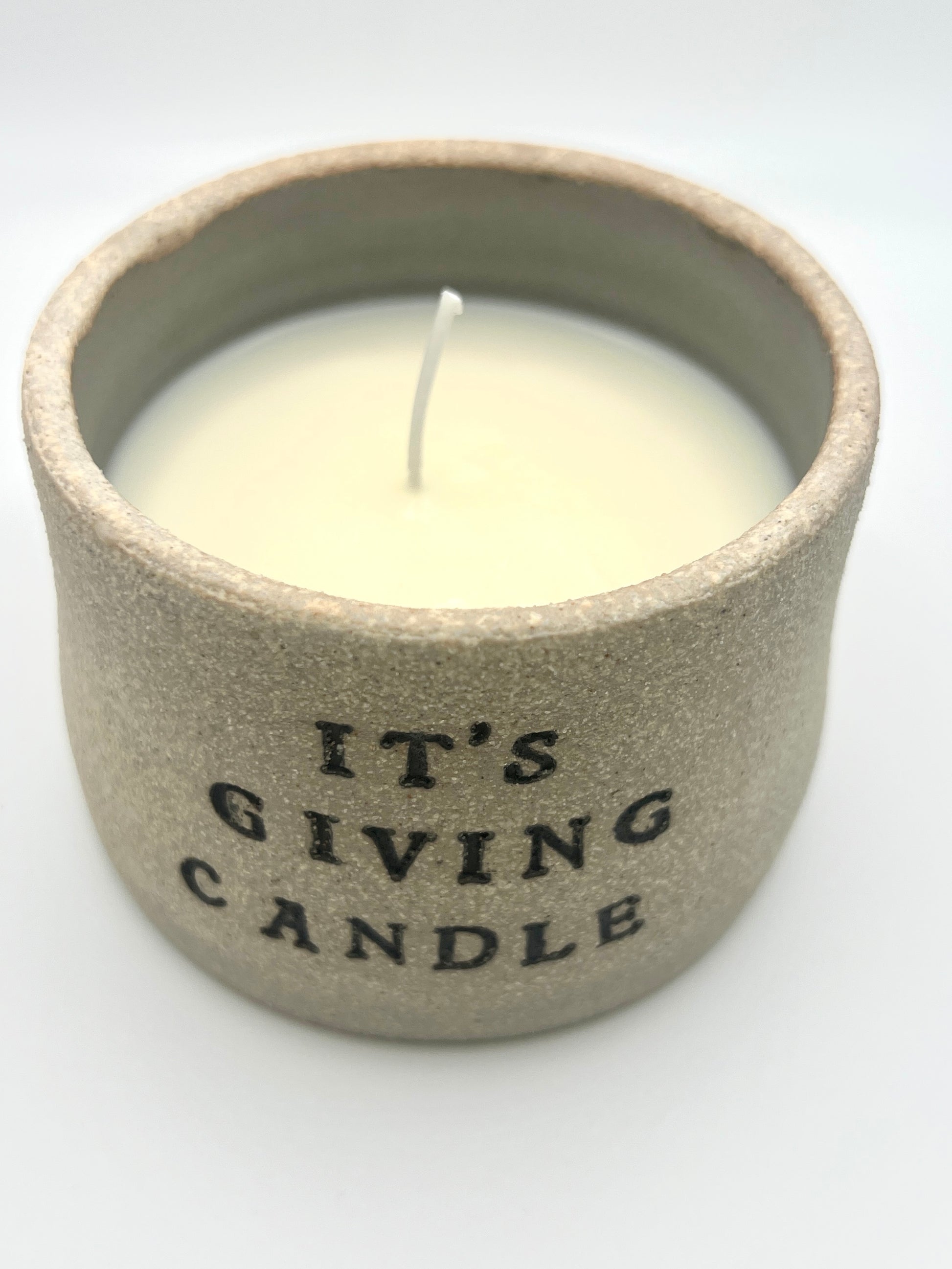 Handmade and handpoured ceramic "It's Giving Candle" soy candle with a gentle vanilla scent. Perfect for anyone who needs a little help understanding the vibe. Candles are approximately 4"x3" with a granite stoneware exterior and dove grey interior.