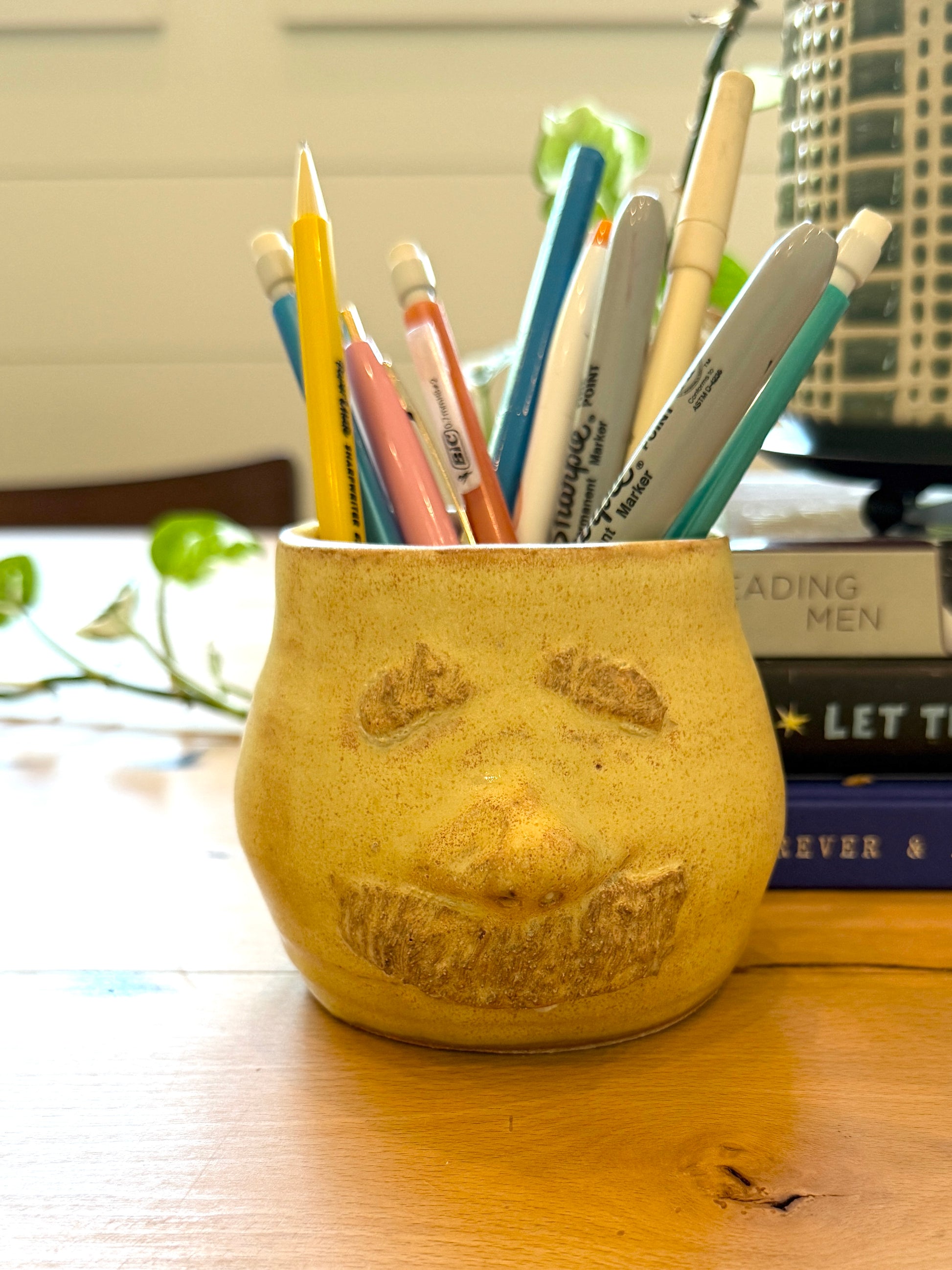 Don is a hand thrown and hand sculpted Zaddy ceramic vessel. Approximately 3.5" x 3.5", this sculptural container is food and dishwasher safe. Use him to organize your office pencils, grow a plant, or hold your suntan lotion.