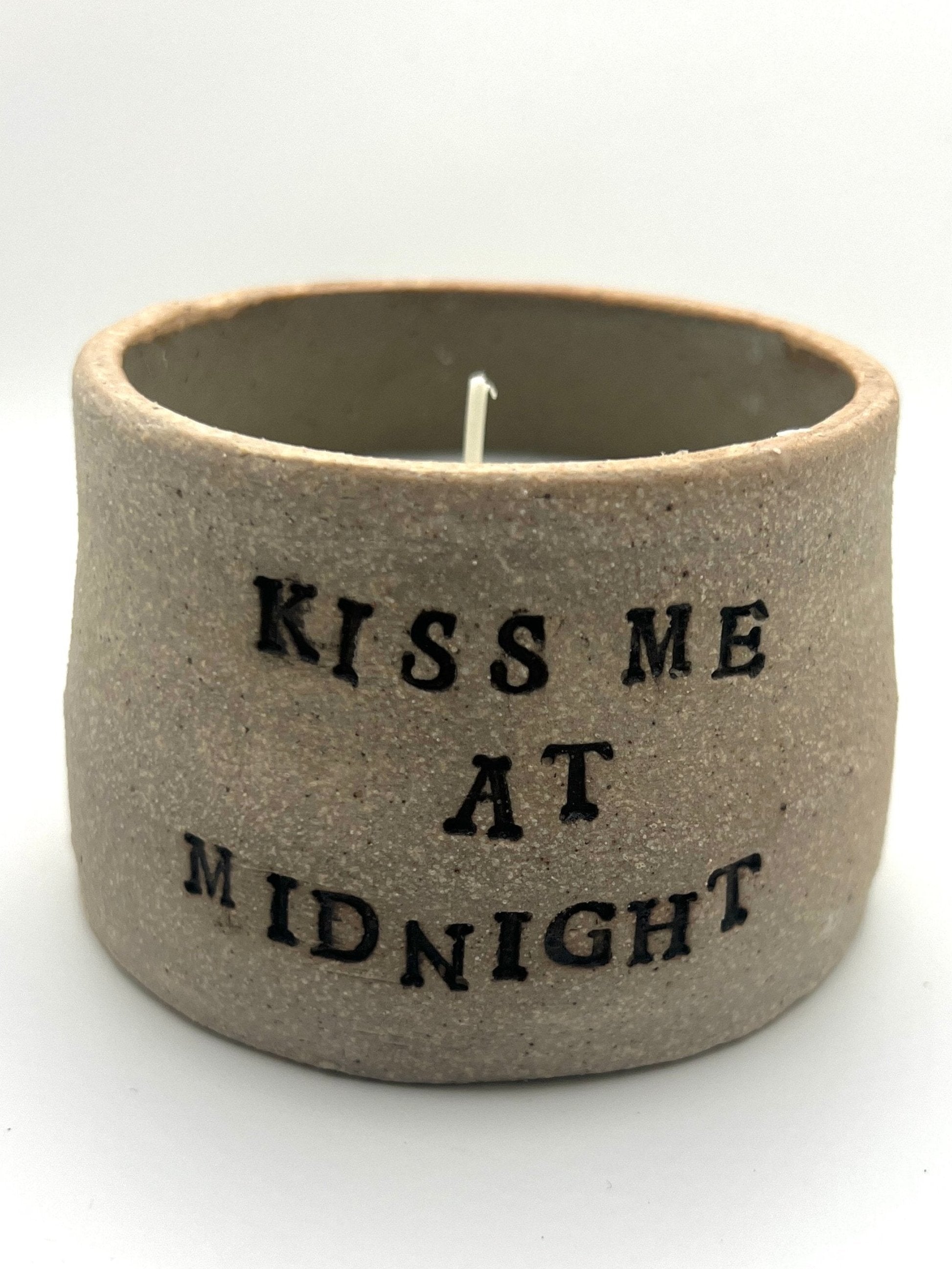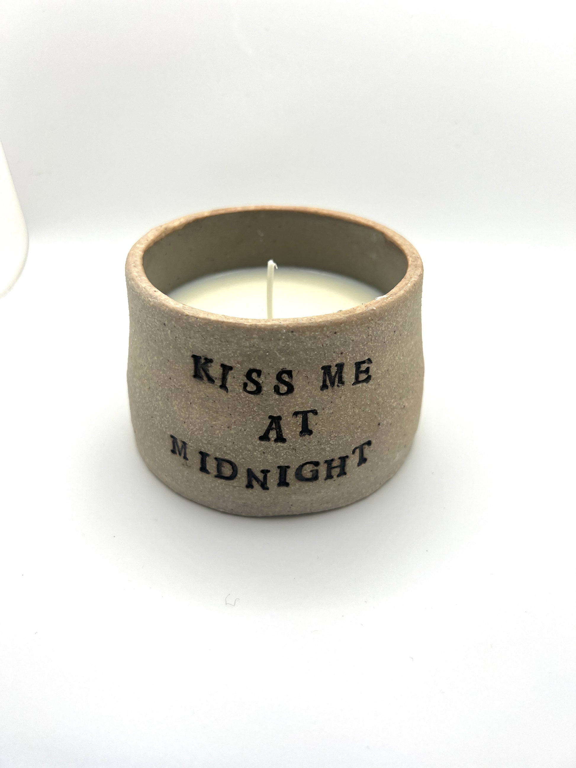 Handmade and handpoured ceramic "Kiss Me at Midnight" soy candle with a gentle vanilla scent. Perfect holiday gift for any last minute shoppers. Candles are approximately 4"x3" with a granite stoneware exterior and dove grey interior.