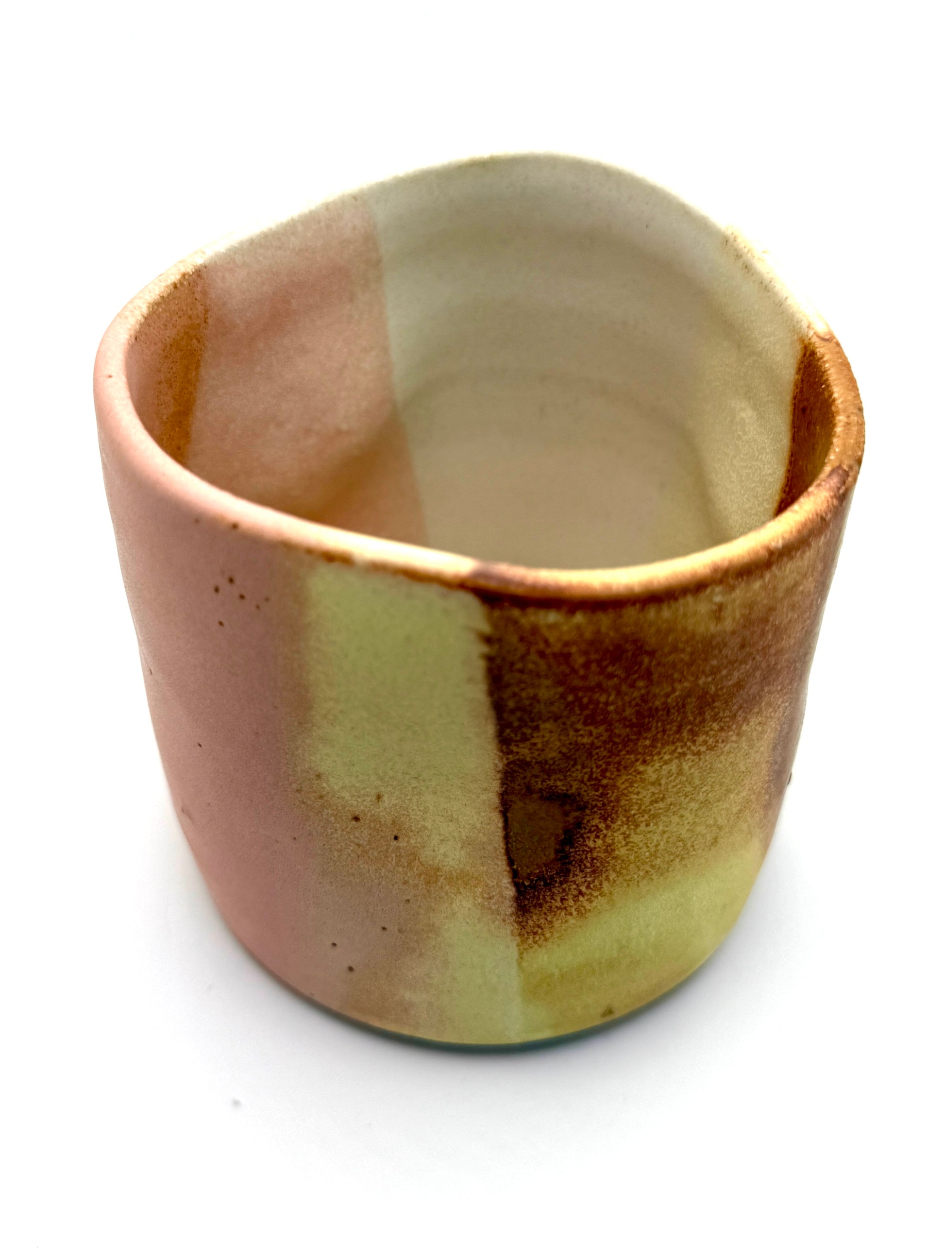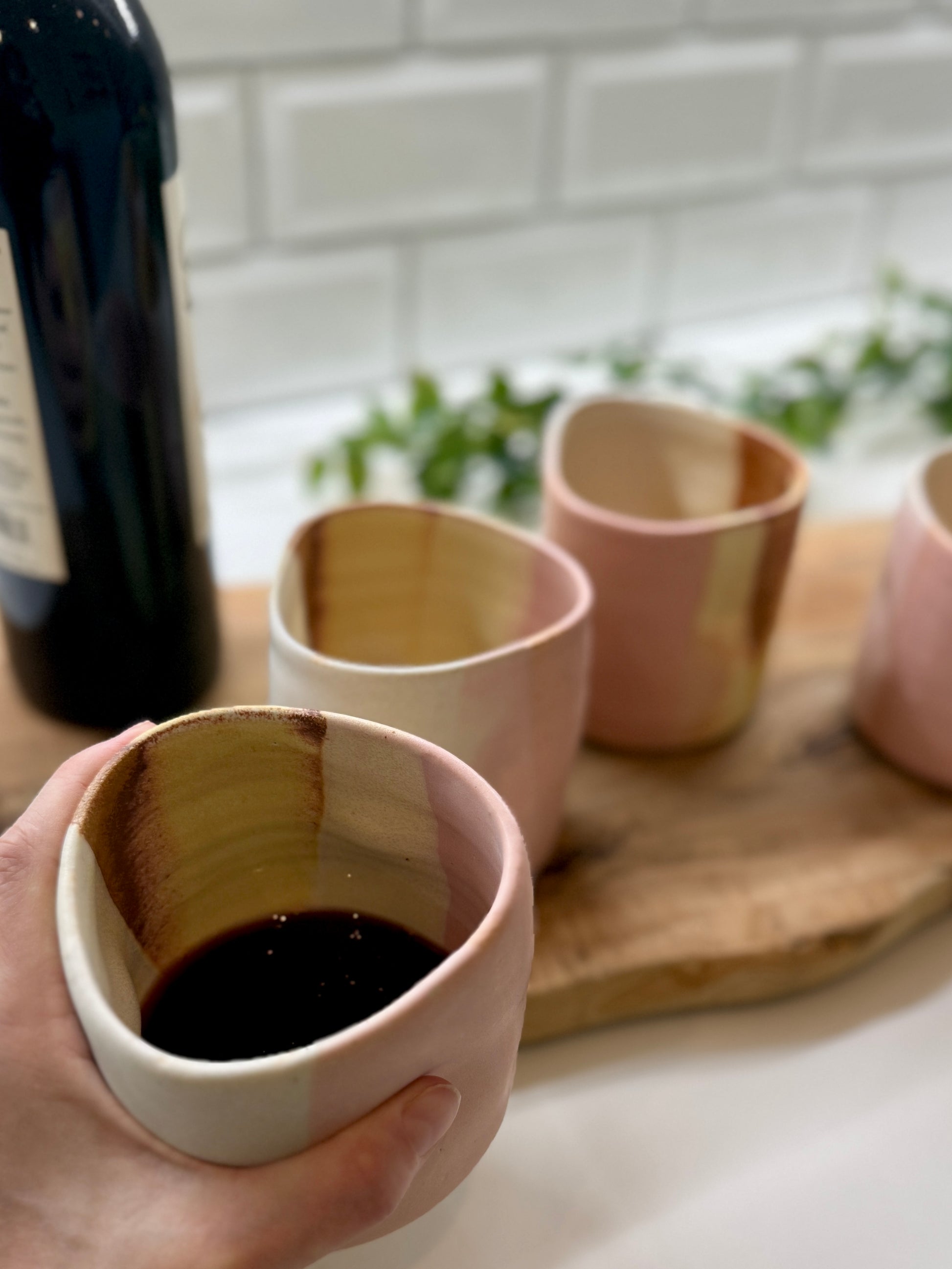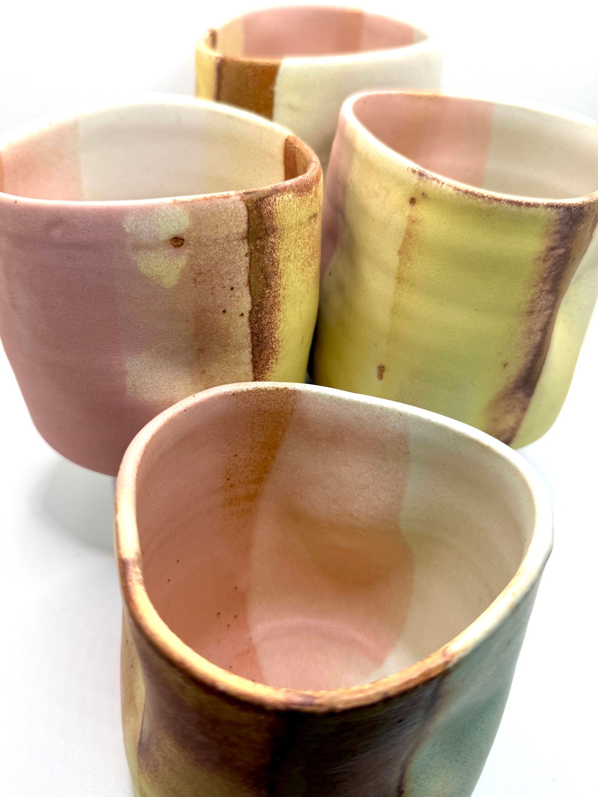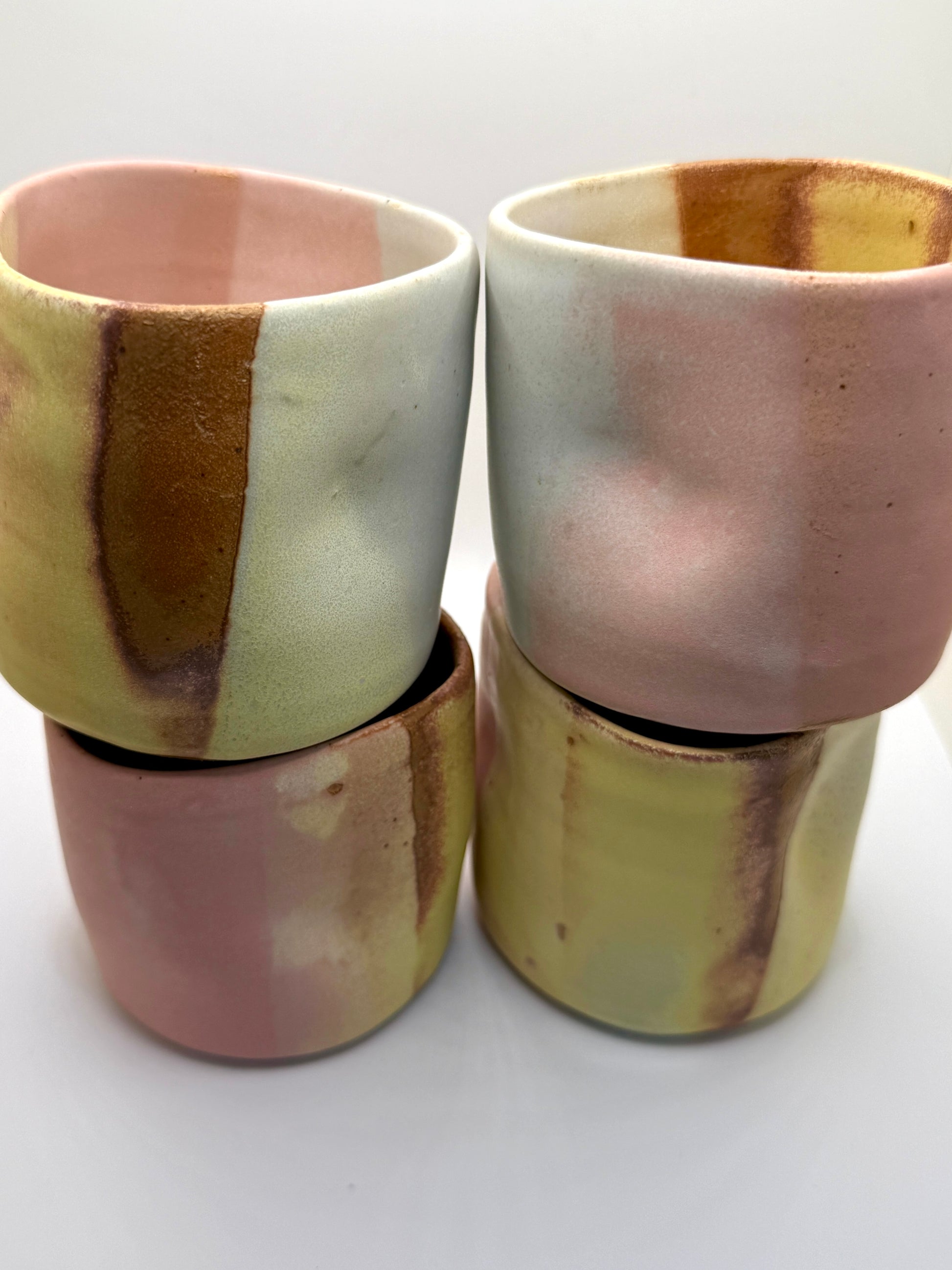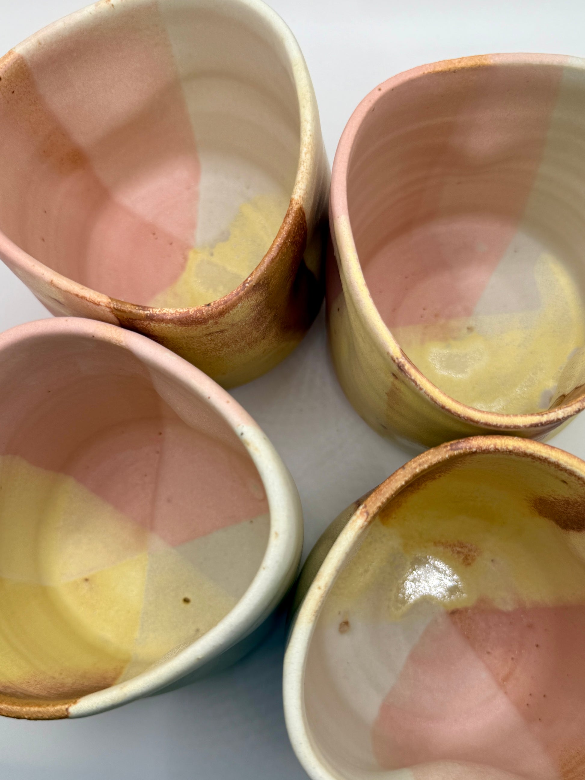 Hand thrown three-tone stoneware mugs that are dishwasher and food safe. This set of 4 mugs is giving Malibu sunset with pink, yellow, and orange tones. Wheel thrown, then distorted to give each mug three finger holds. 3.5"x3.5".