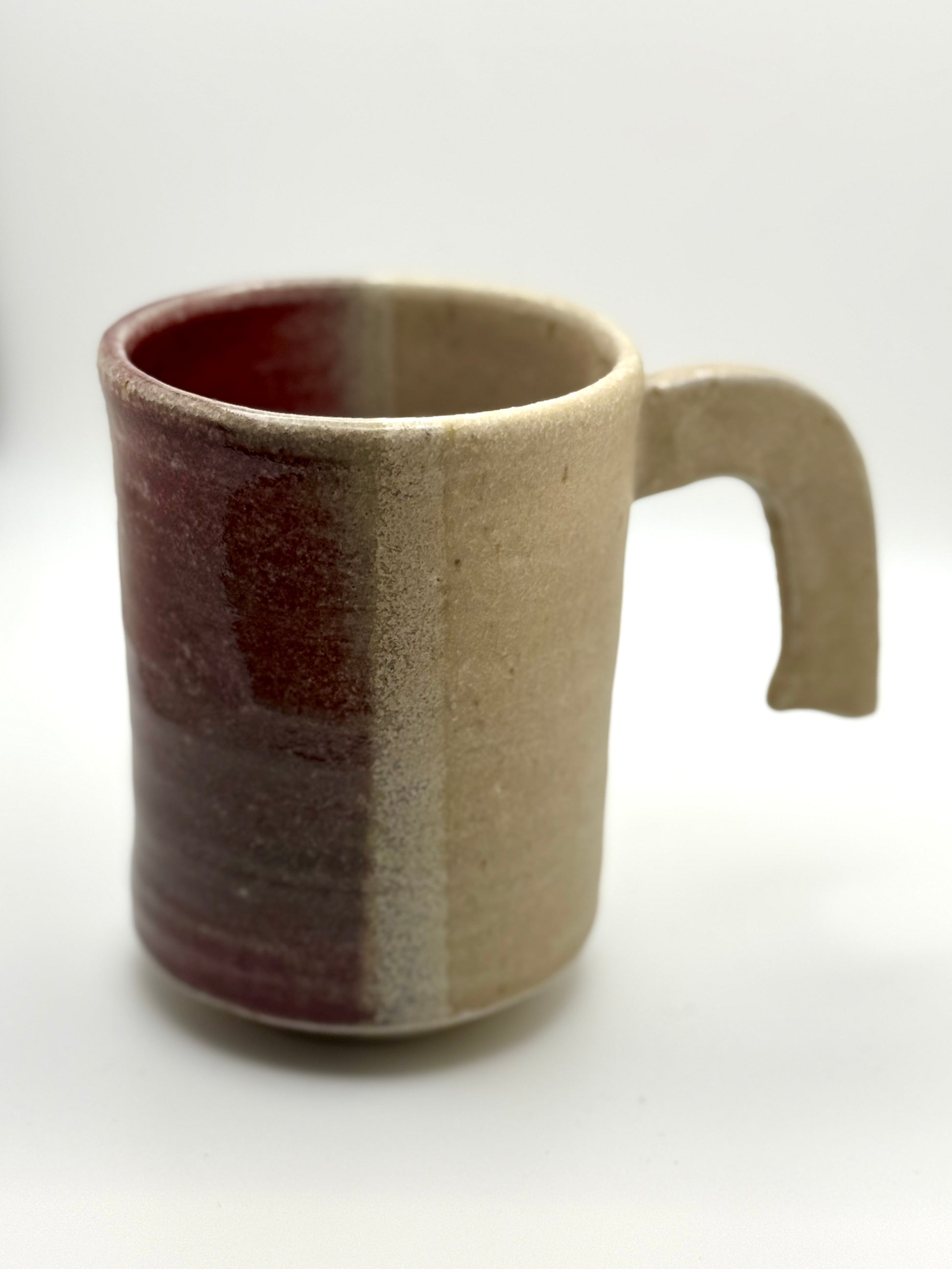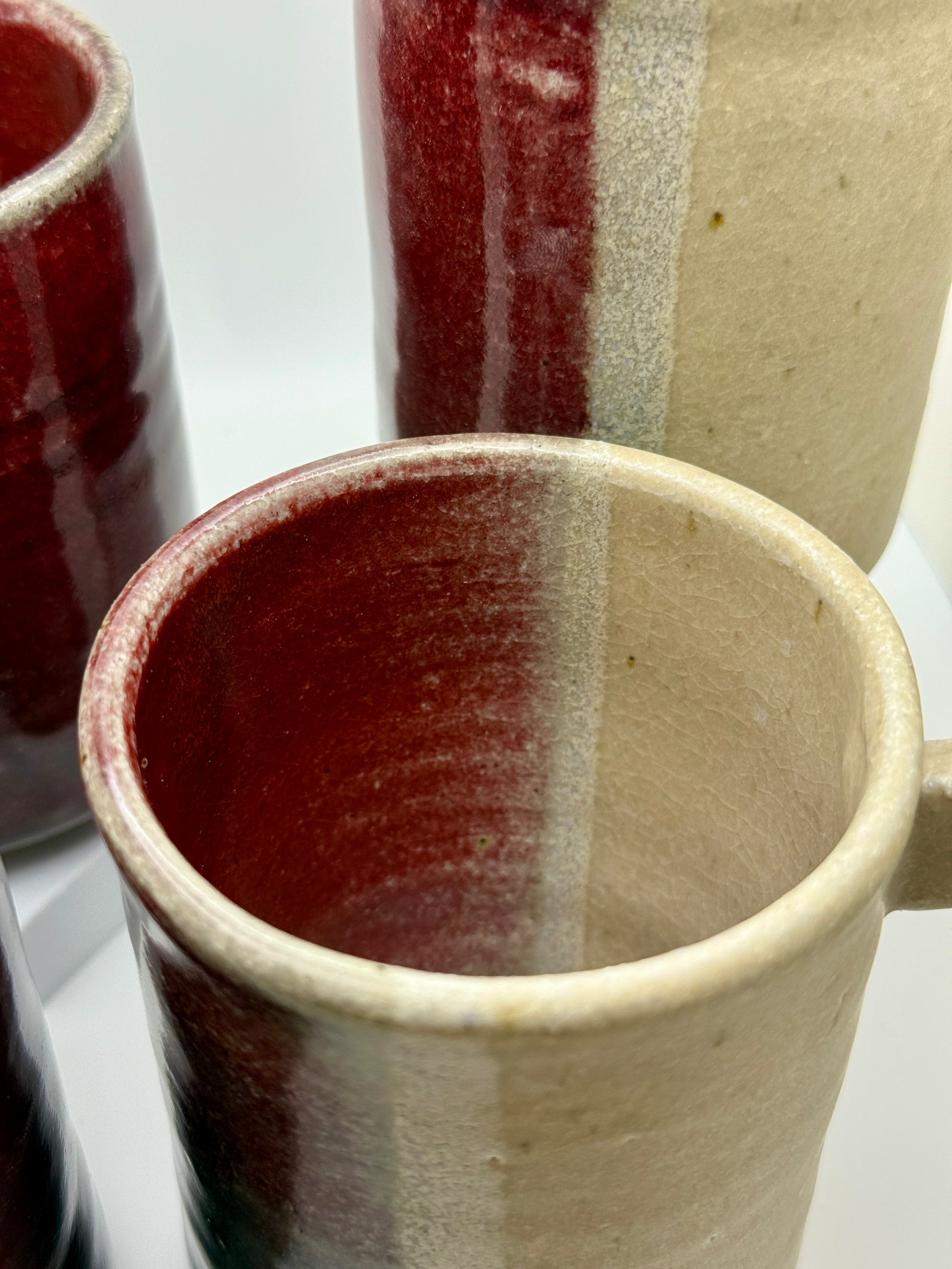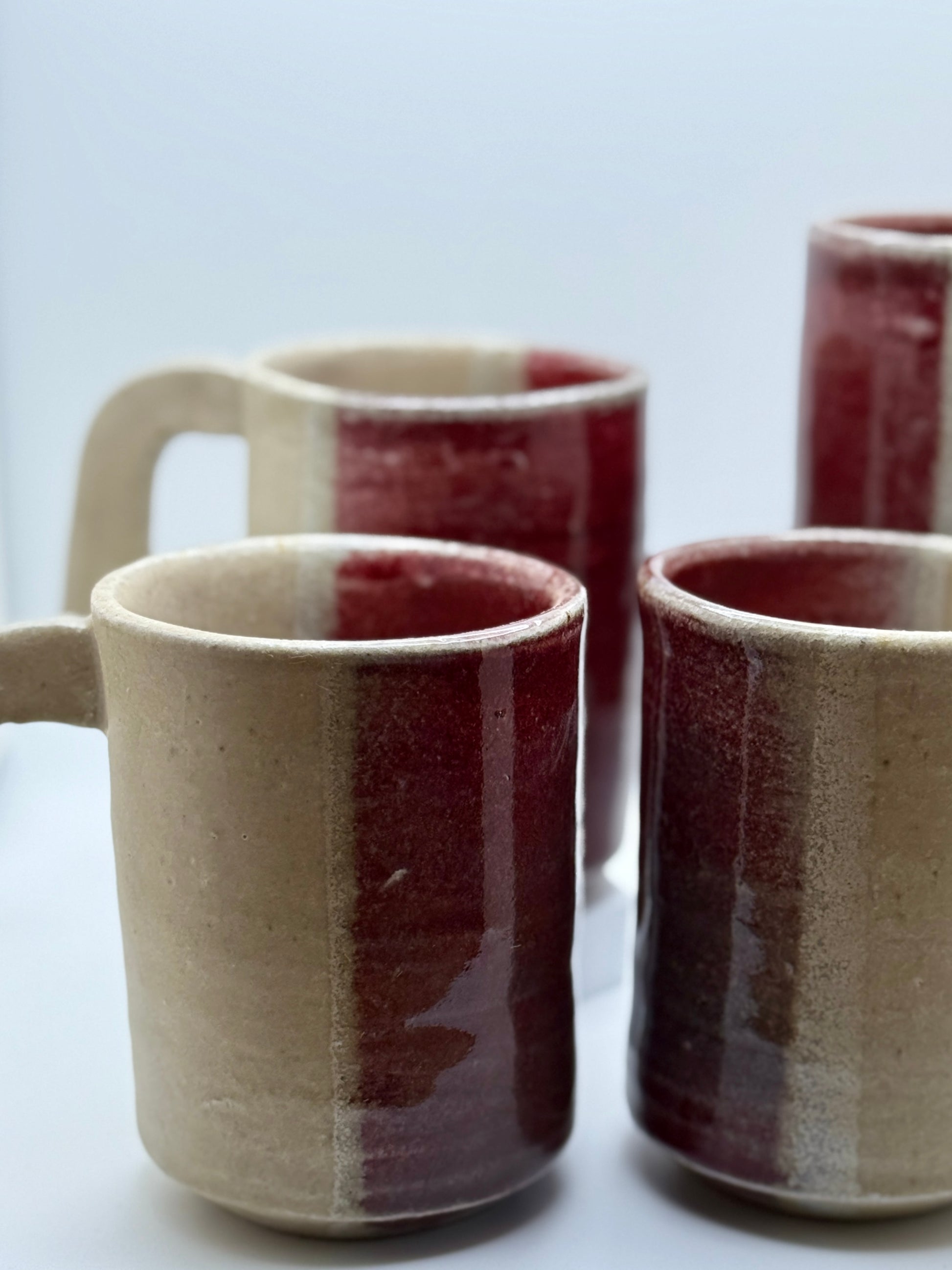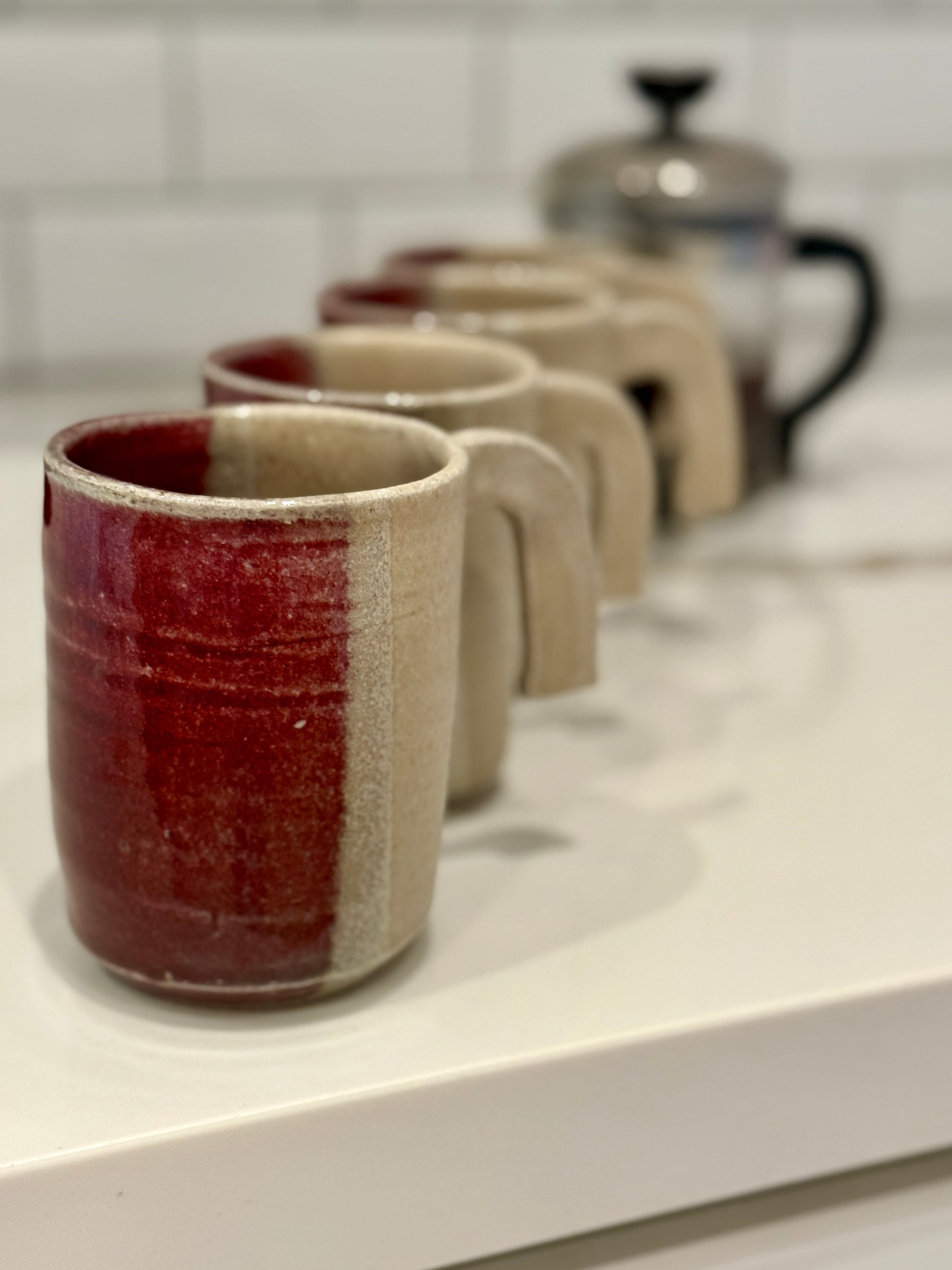 Hand thrown two-tone stoneware mugs that are dishwasher and food safe. This set of 4 mugs has a midcentury modern feel. 4"x3" with open handles they're the perfect way to start your day right.