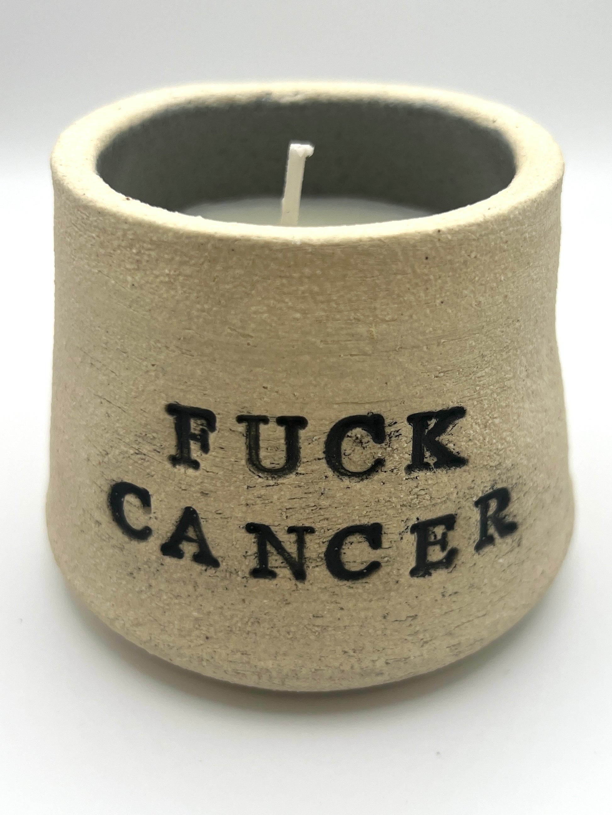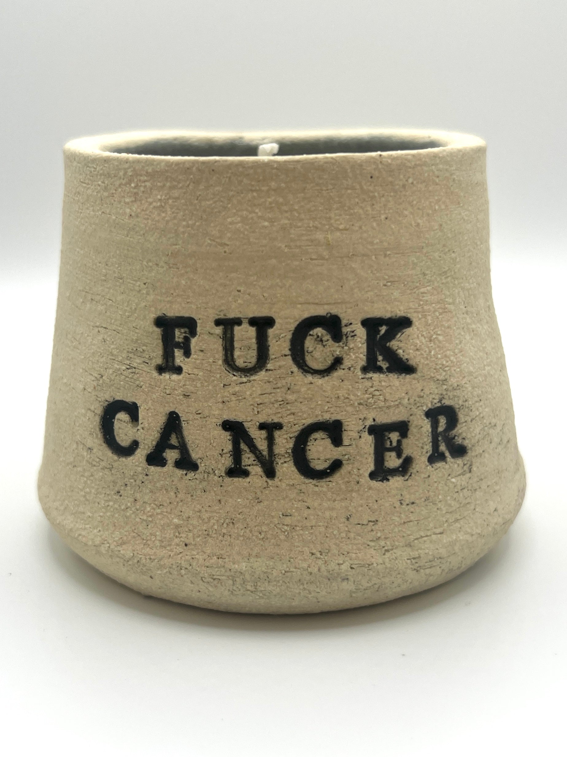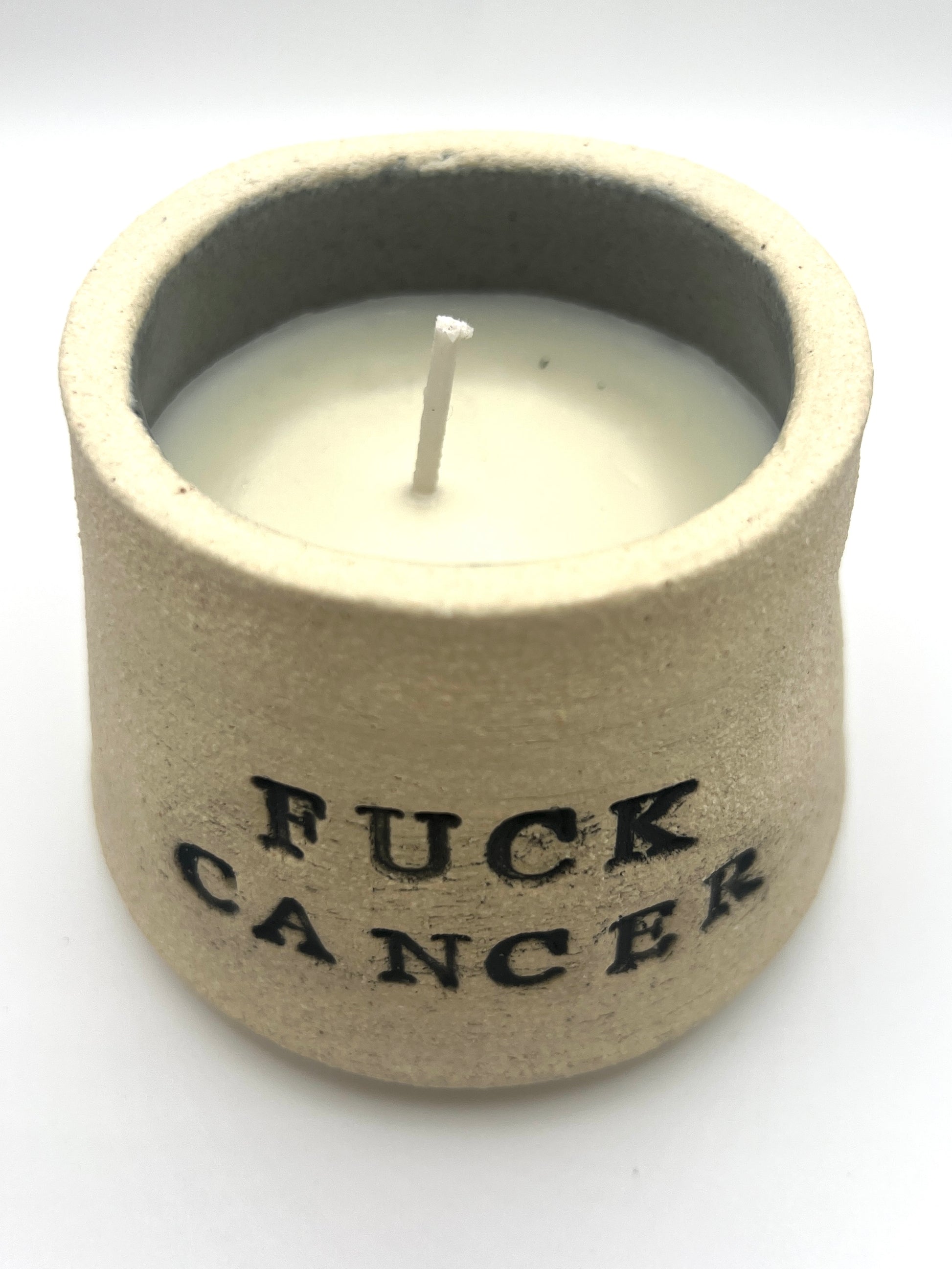 Handmade and handpoured ceramic candle with a gentle vanilla scent. Candles are approximately 4"x3" with a raw stoneware exterior and dark grey interior.