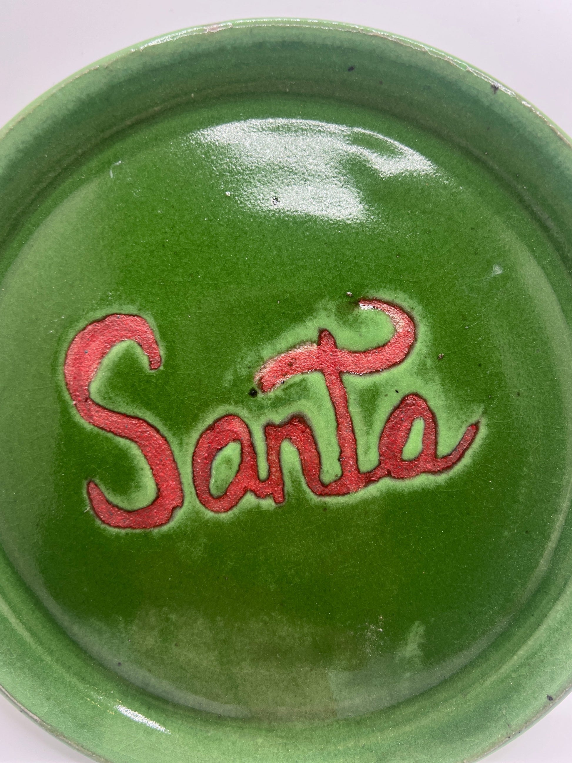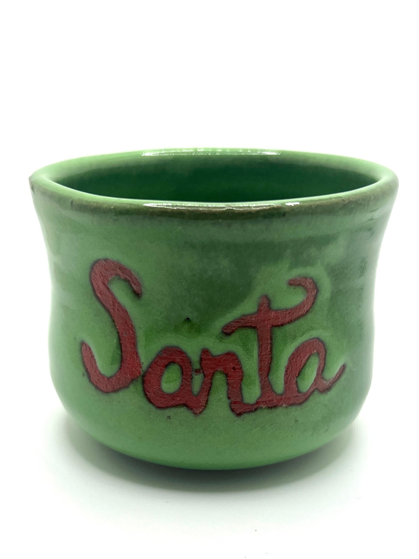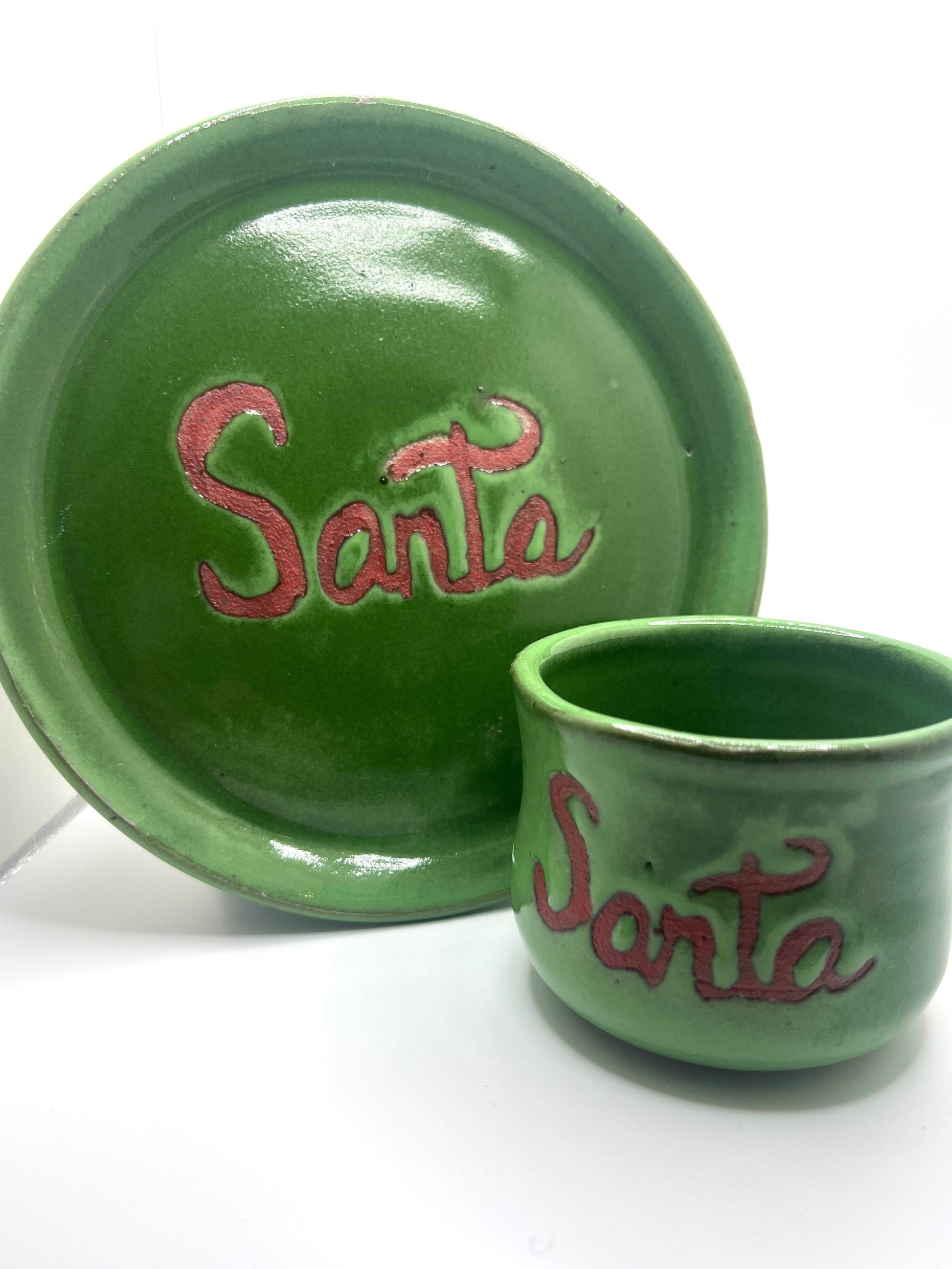 Set out milk and cookies for the Big Guy with this vibrant holiday inspired plate and cup set. Plate is 7" round and cup is 3" x 3". Food safe and dishwasher safe.