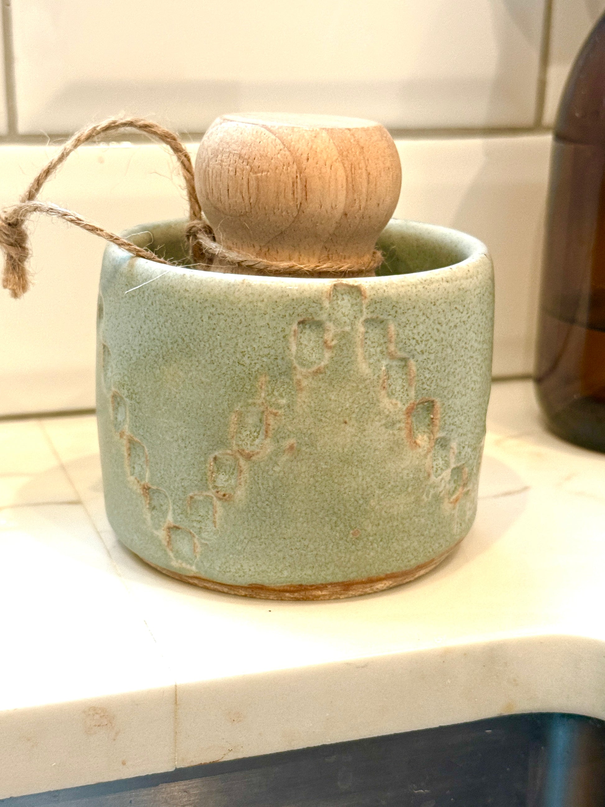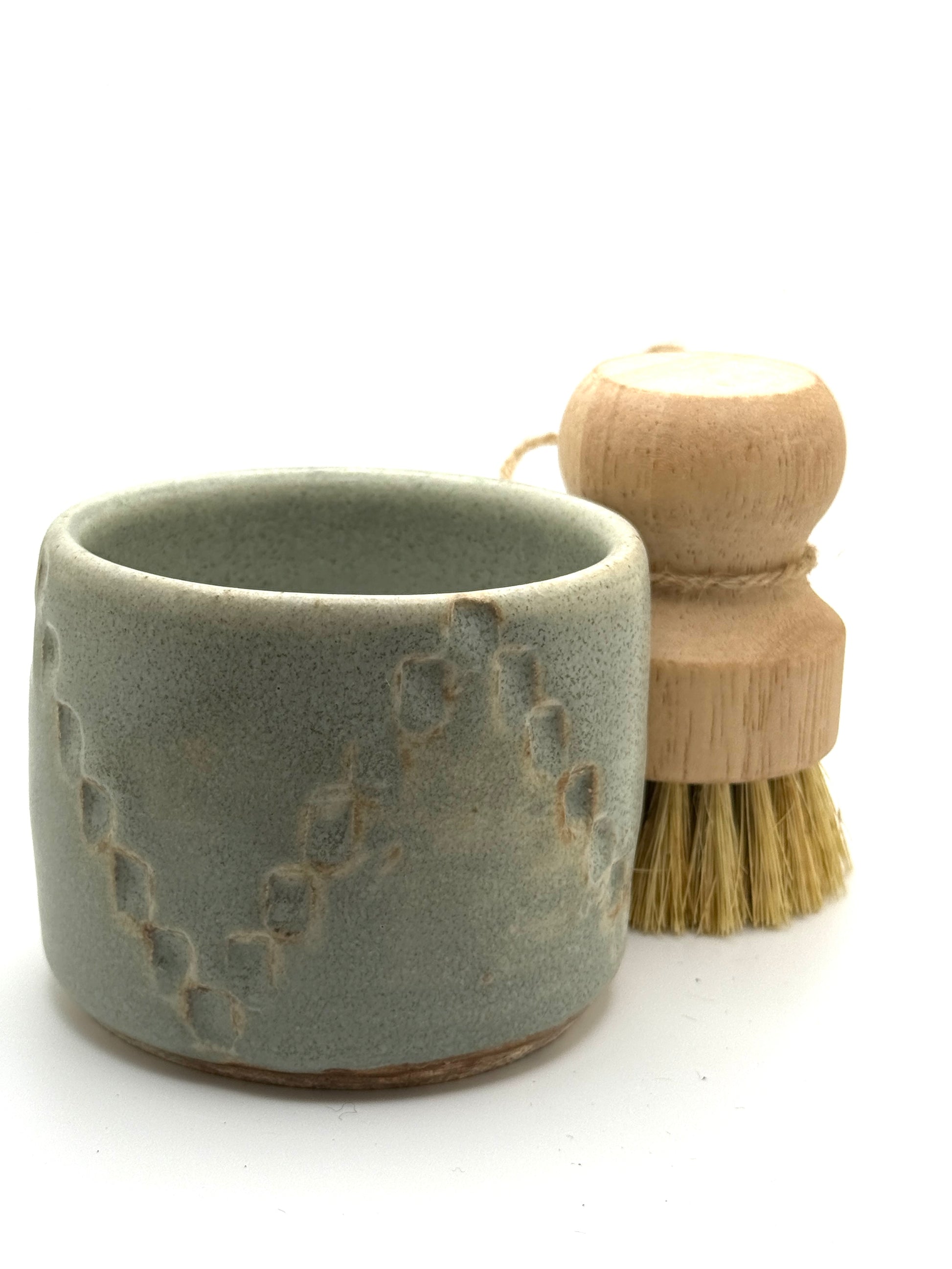 Clean your veggies with this bamboo scrub brush nestled in a dishwasher and food safe ceramic dish. Approximately 3"x3" and elegantly hand carved.