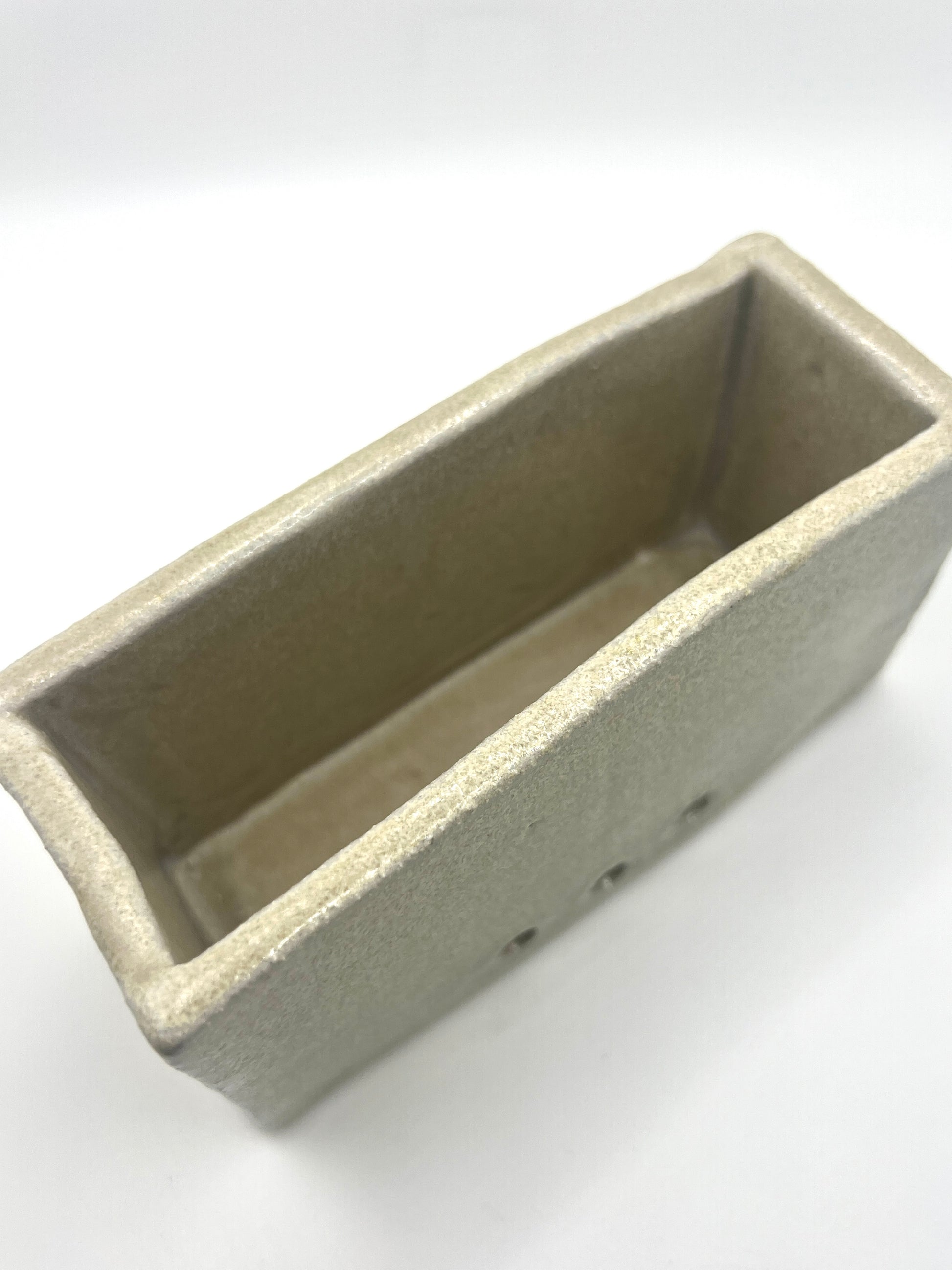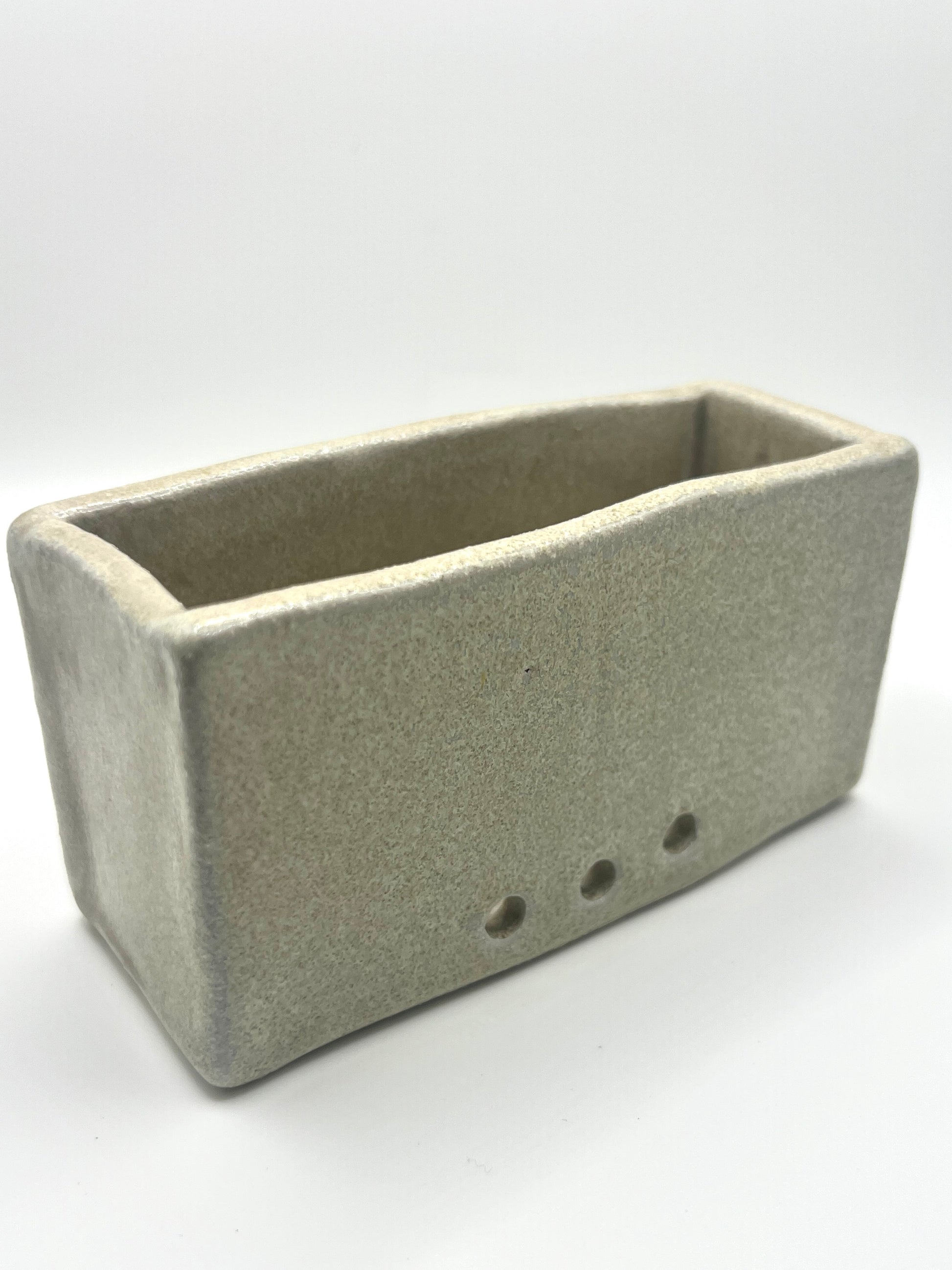 Keep your sponge clean in style with this handbuilt stoneware ceramic sponge holder. Water safe and dishwasher safe, this makes cleaning a breeze. Roughly 5 inches wide, 3 inches high, 2 inches wide