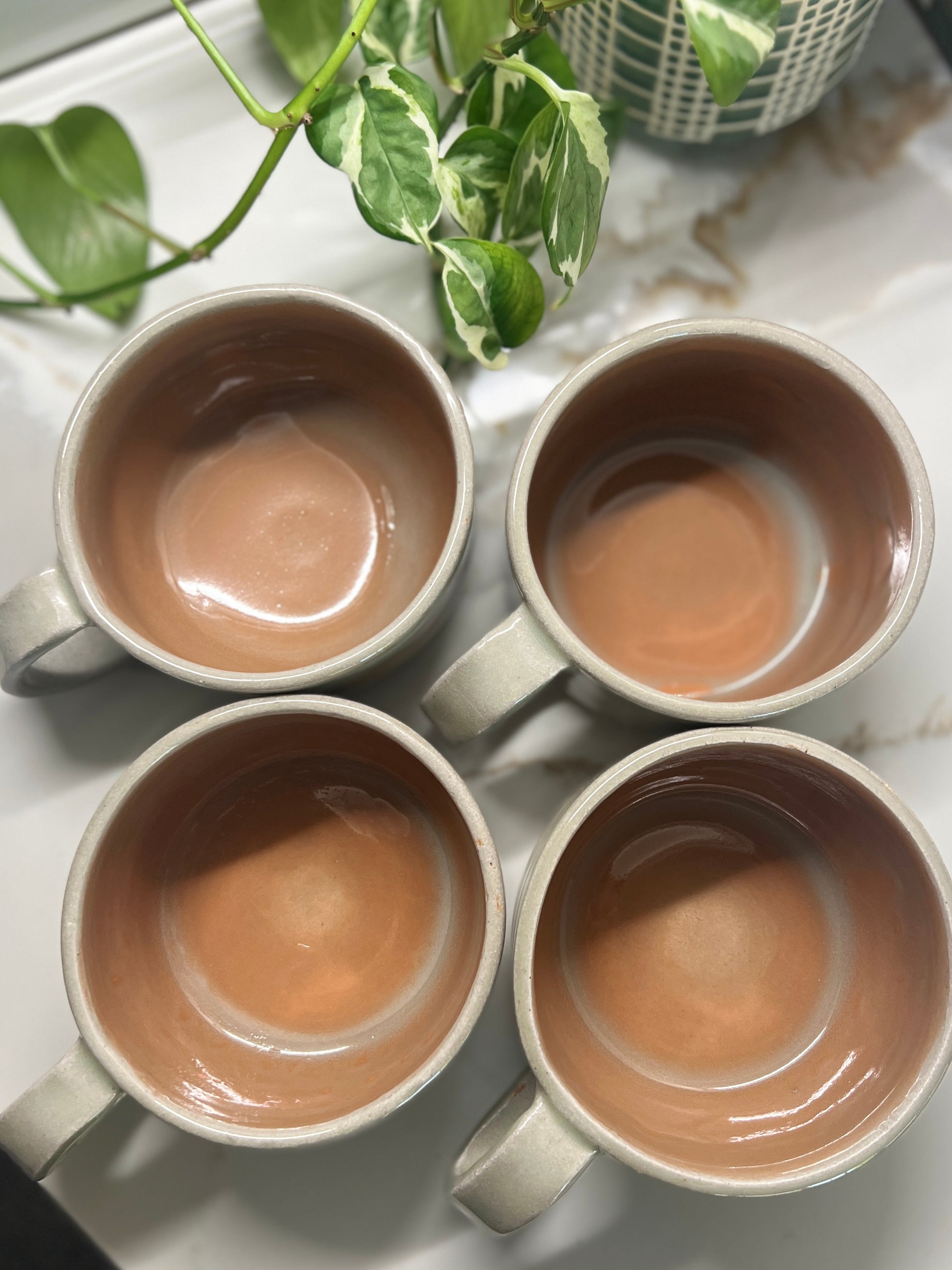 Hand thrown stoneware mugs that are dishwasher and food safe. These latte bowls are approximately 3 inches high and 4.75 inches wide, with a handle that extends up to 1.25 inches at the center. Discounted because of some minor glazing flaws! Sold as a set of 4.