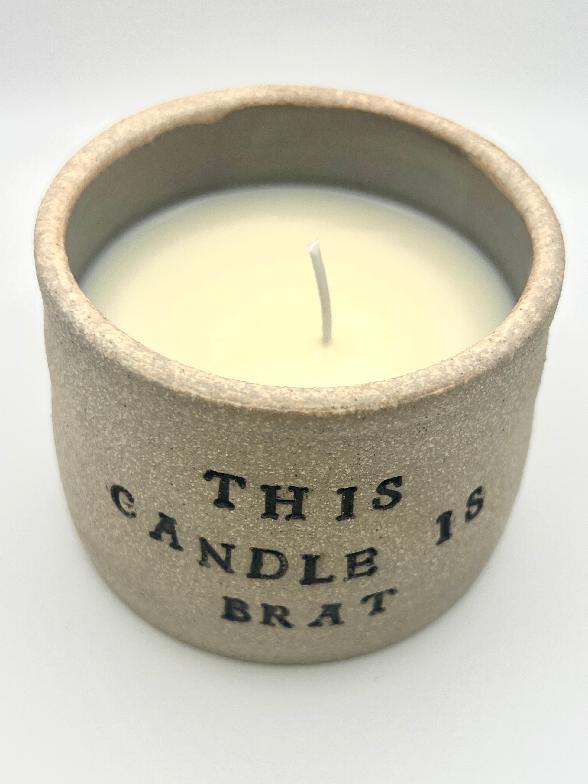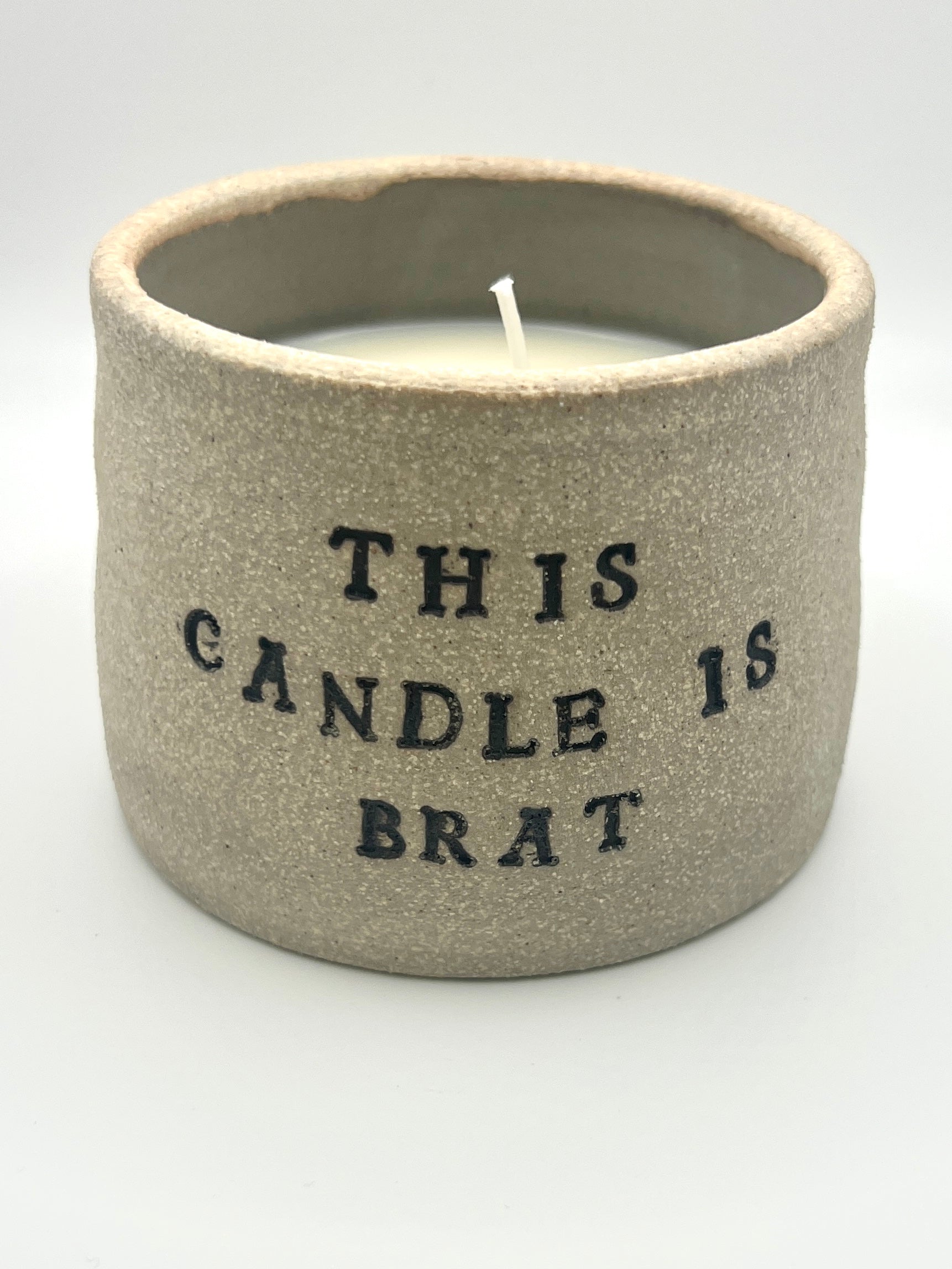 Handmade and handpoured ceramic "This Candle Is Brat" soy candle with a gentle vanilla scent. It's brat. Candles are approximately 4"x3" with a granite stoneware exterior and dove grey interior.