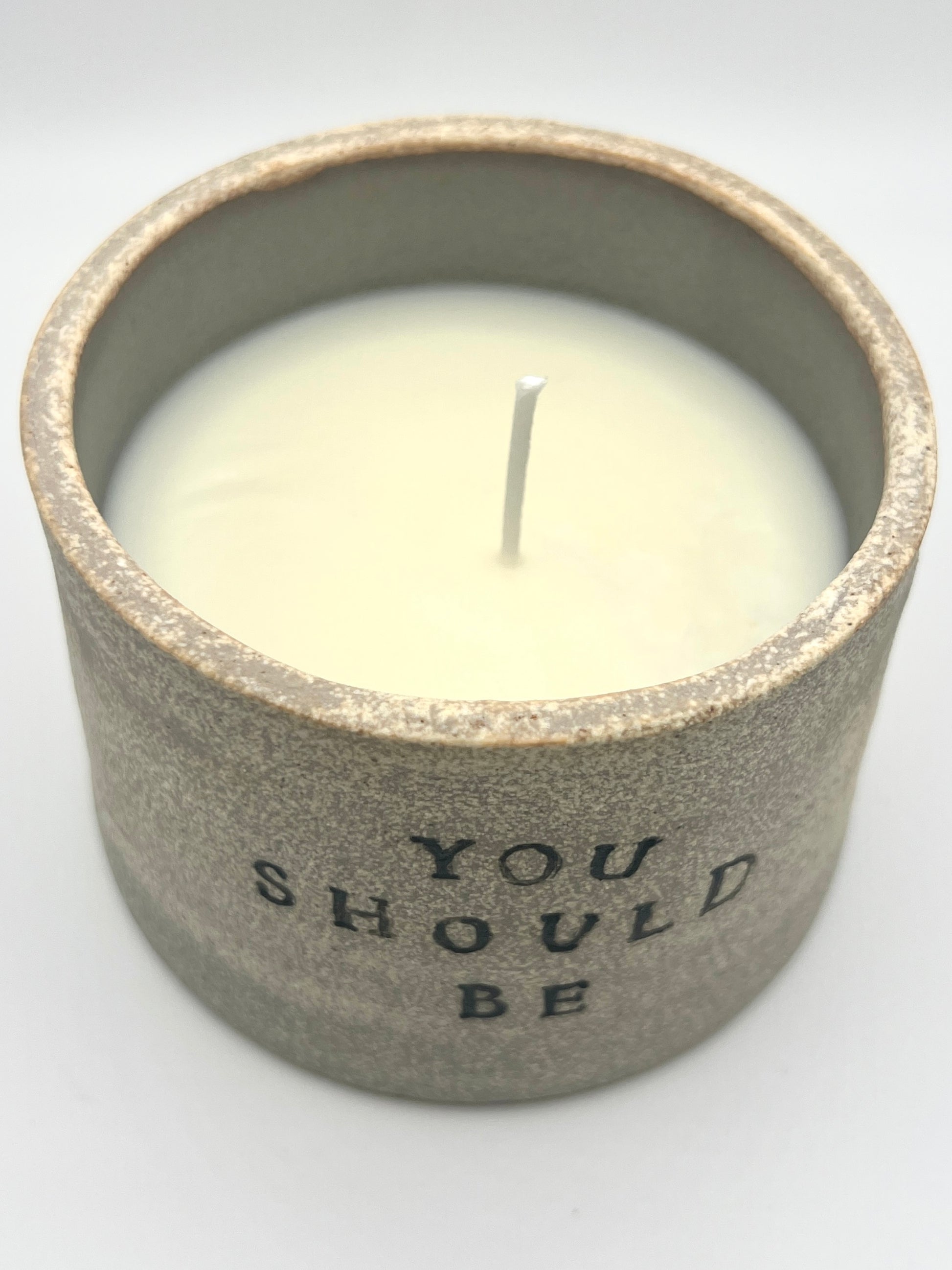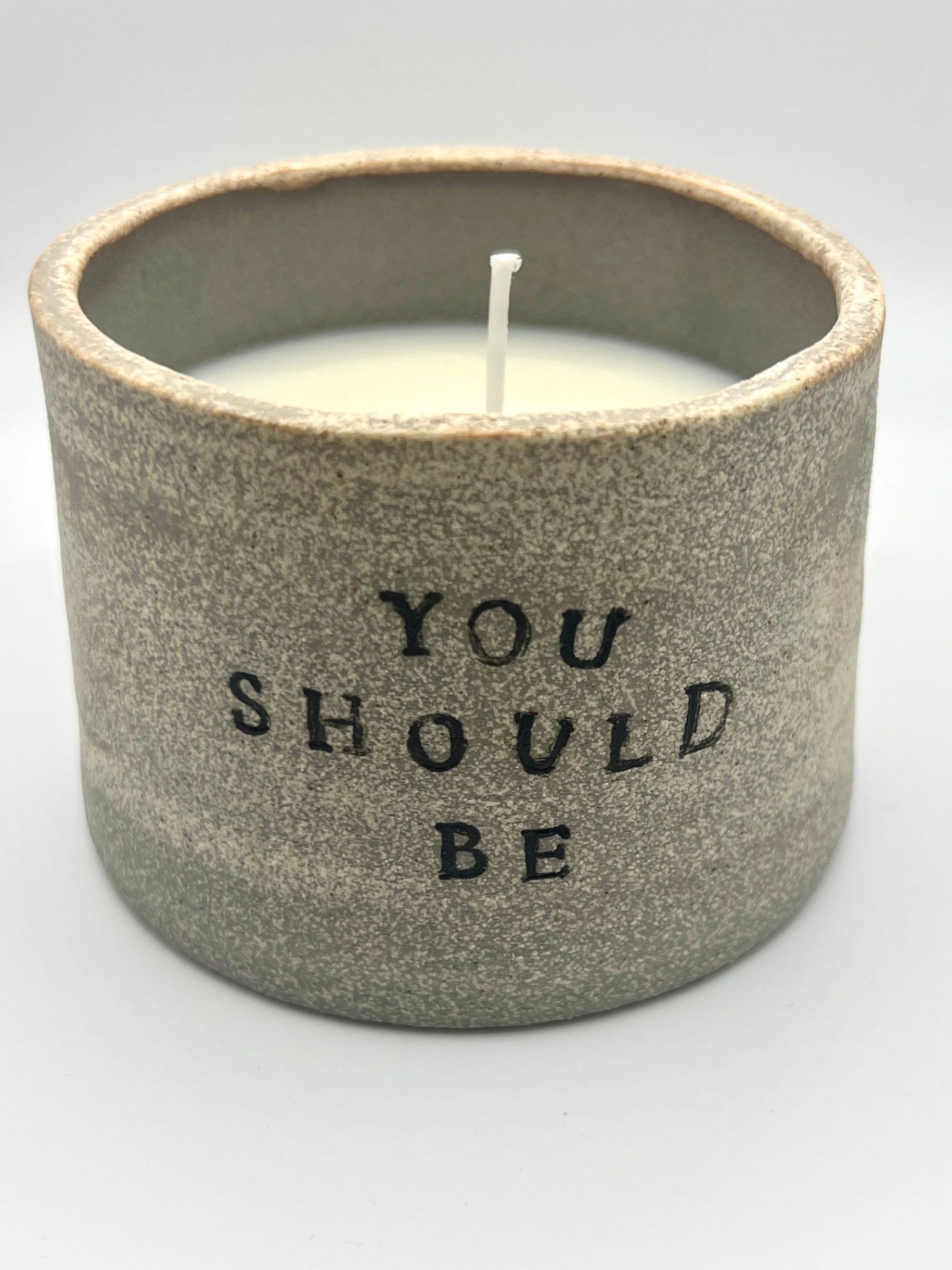 Handmade and handpoured ceramic "You Should Be" soy candle with a gentle vanilla scent. For any TSwift fans who need to let their rage burn. Candles are approximately 4"x3" with a granite stoneware exterior and dove grey interior.