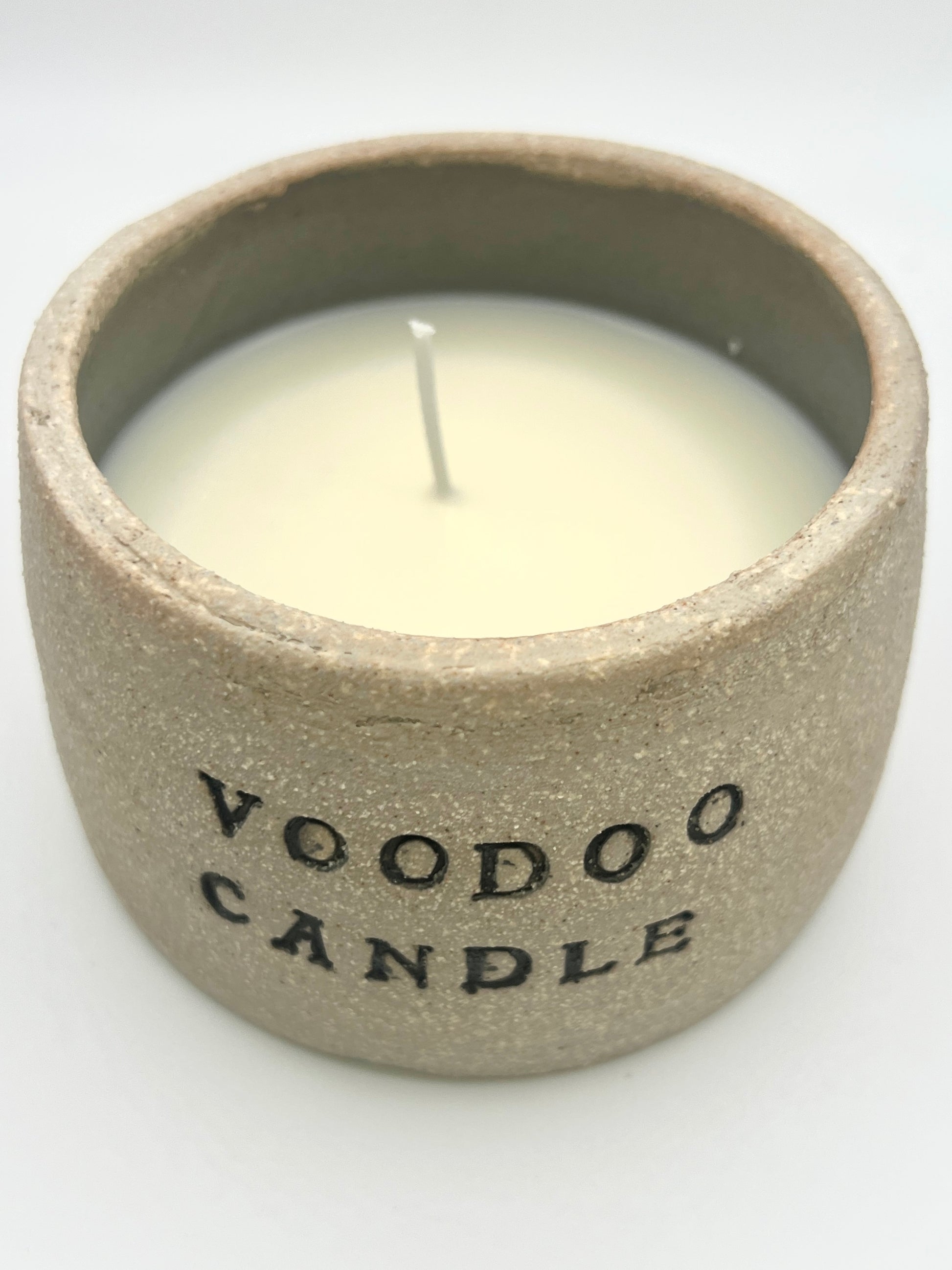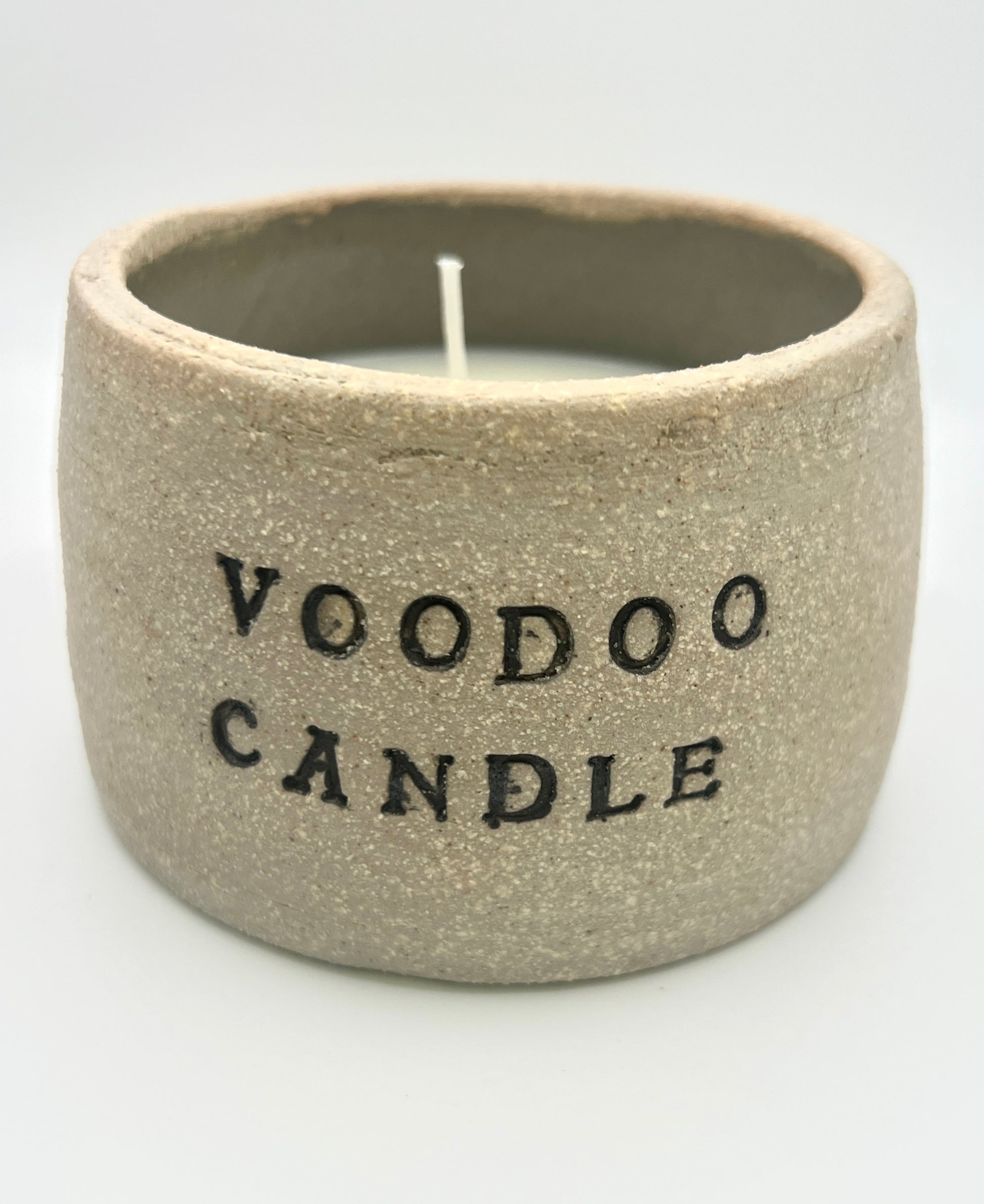 Handmade and handpoured ceramic "Voodoo Candle" soy candle with a gentle vanilla scent. Perfect for a friend who needs to burn something down. Candles are approximately 4"x3" with a granite stoneware exterior and dove grey interior.