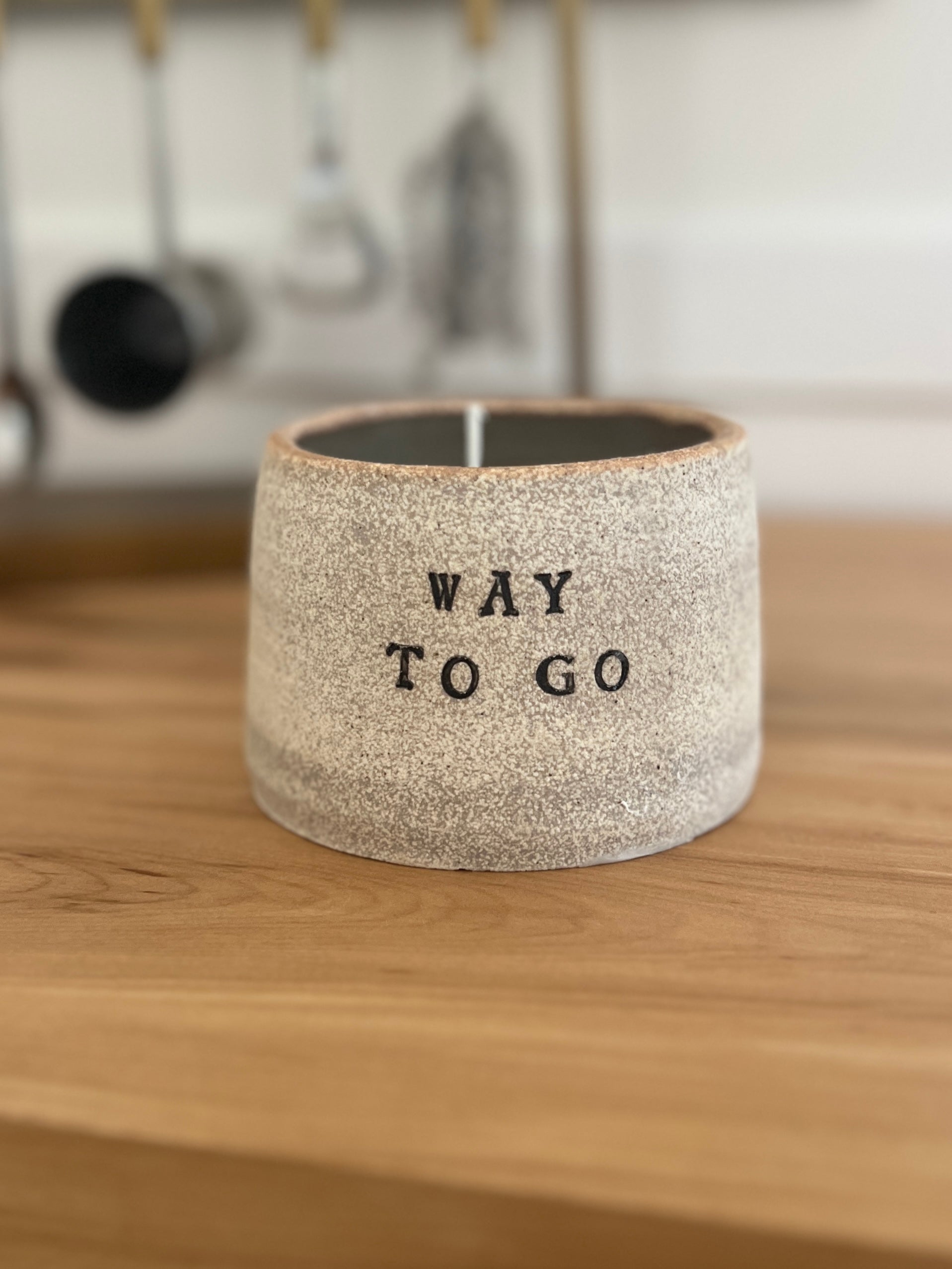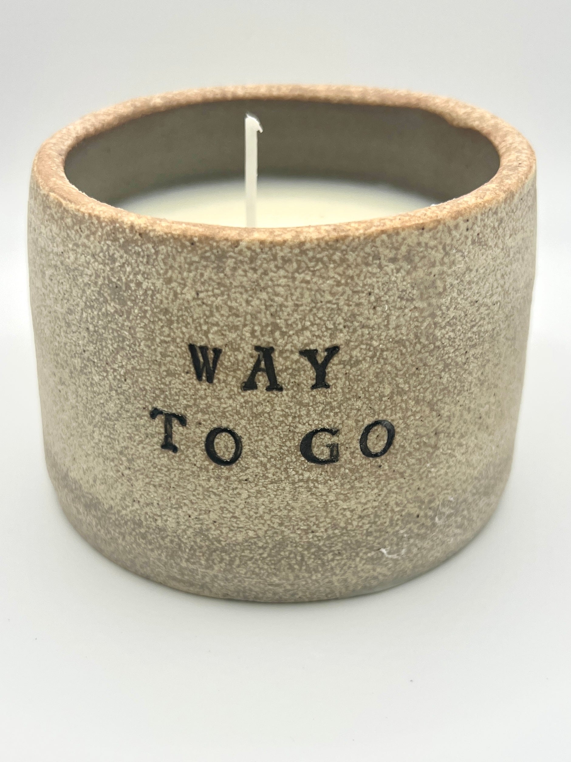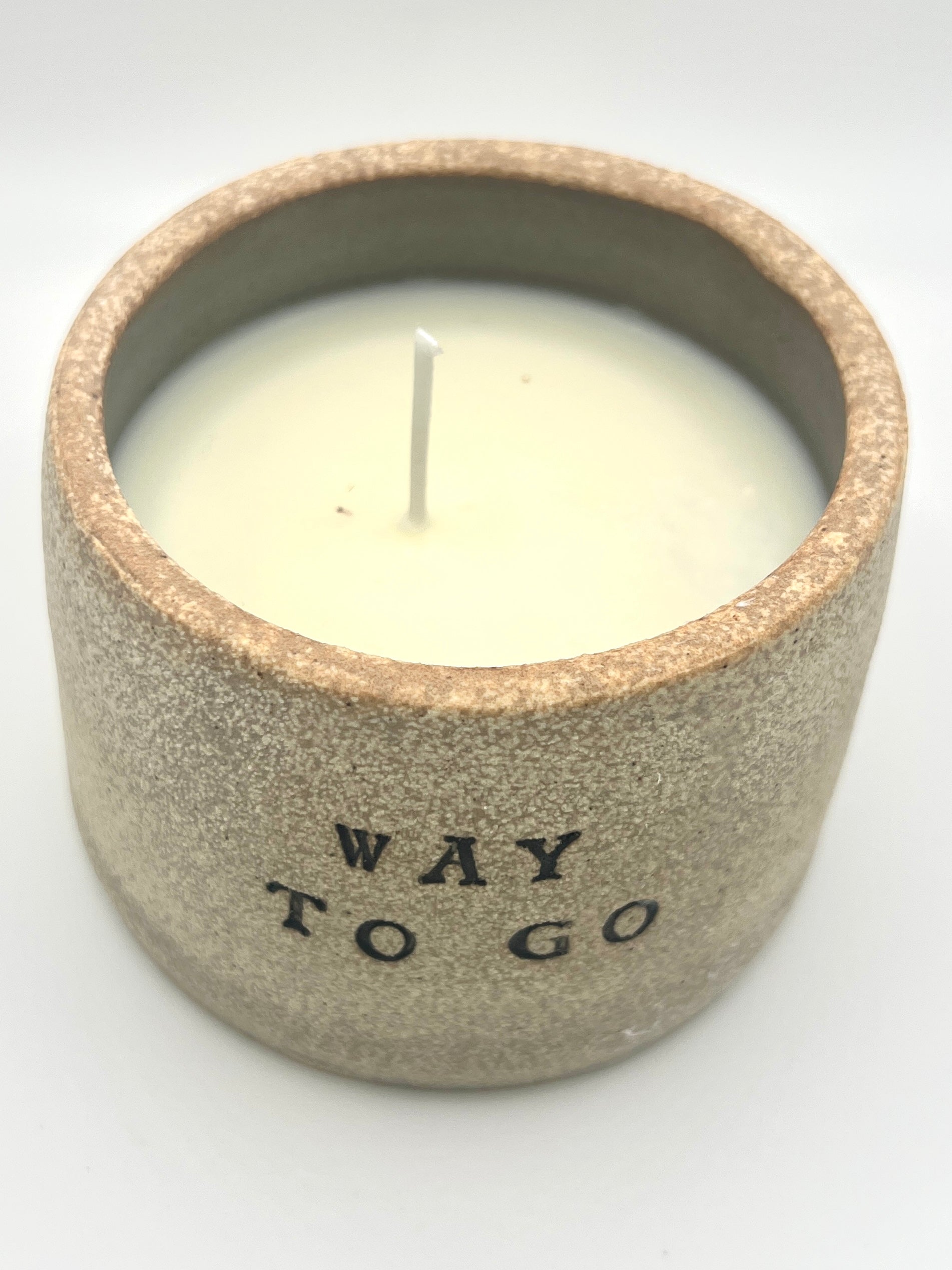 Handmade and handpoured "Way To Go" ceramic soy candle with a gentle vanilla scent. Perfect to tell someone congratulations or cheer them on from afar! Candles are approximately 4"x3" with a granite stoneware exterior and dove grey interior.