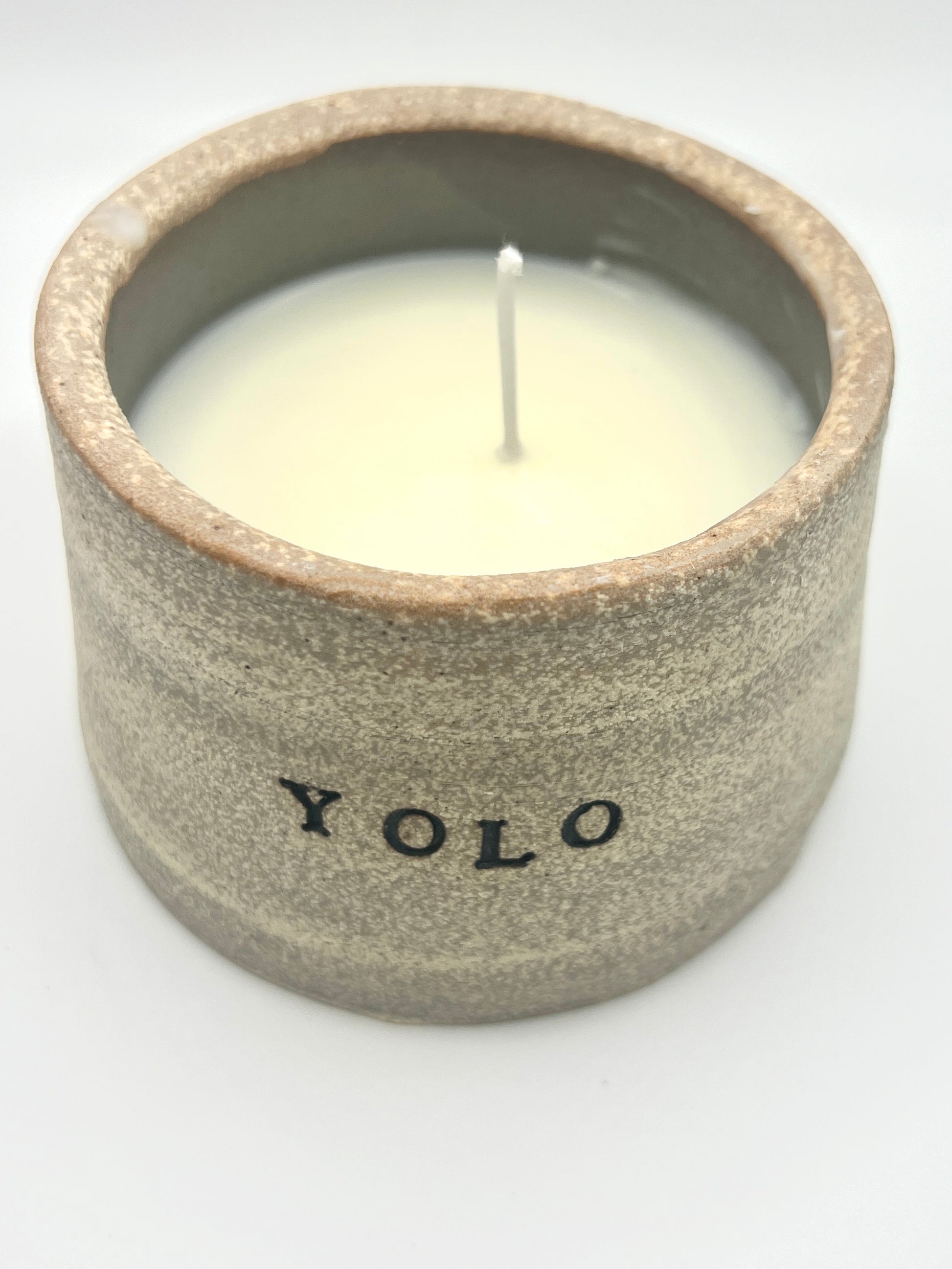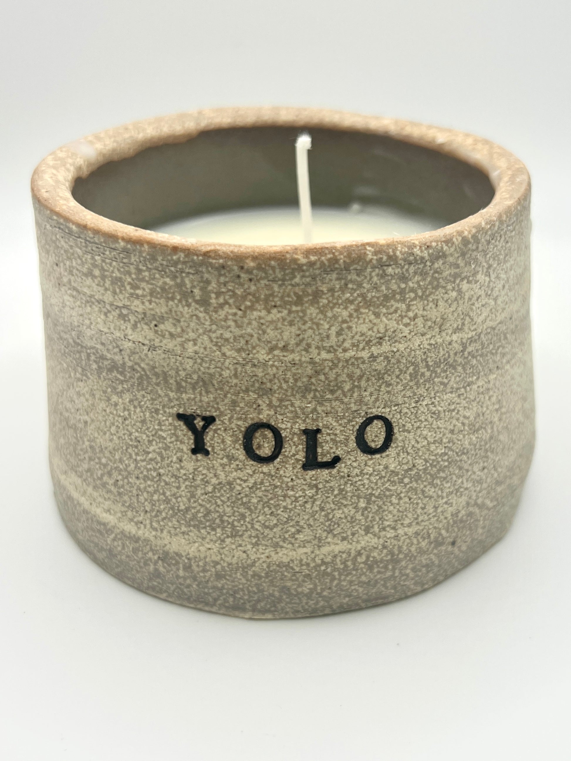 Handmade and handpoured ceramic "YOLO" soy candle with a gentle vanilla scent. Buy it, why not? Candles are approximately 4"x3" with a granite stoneware exterior and dove grey interior.